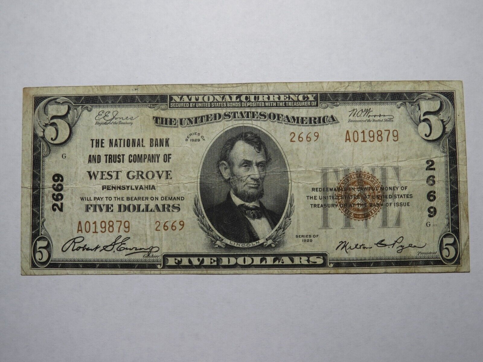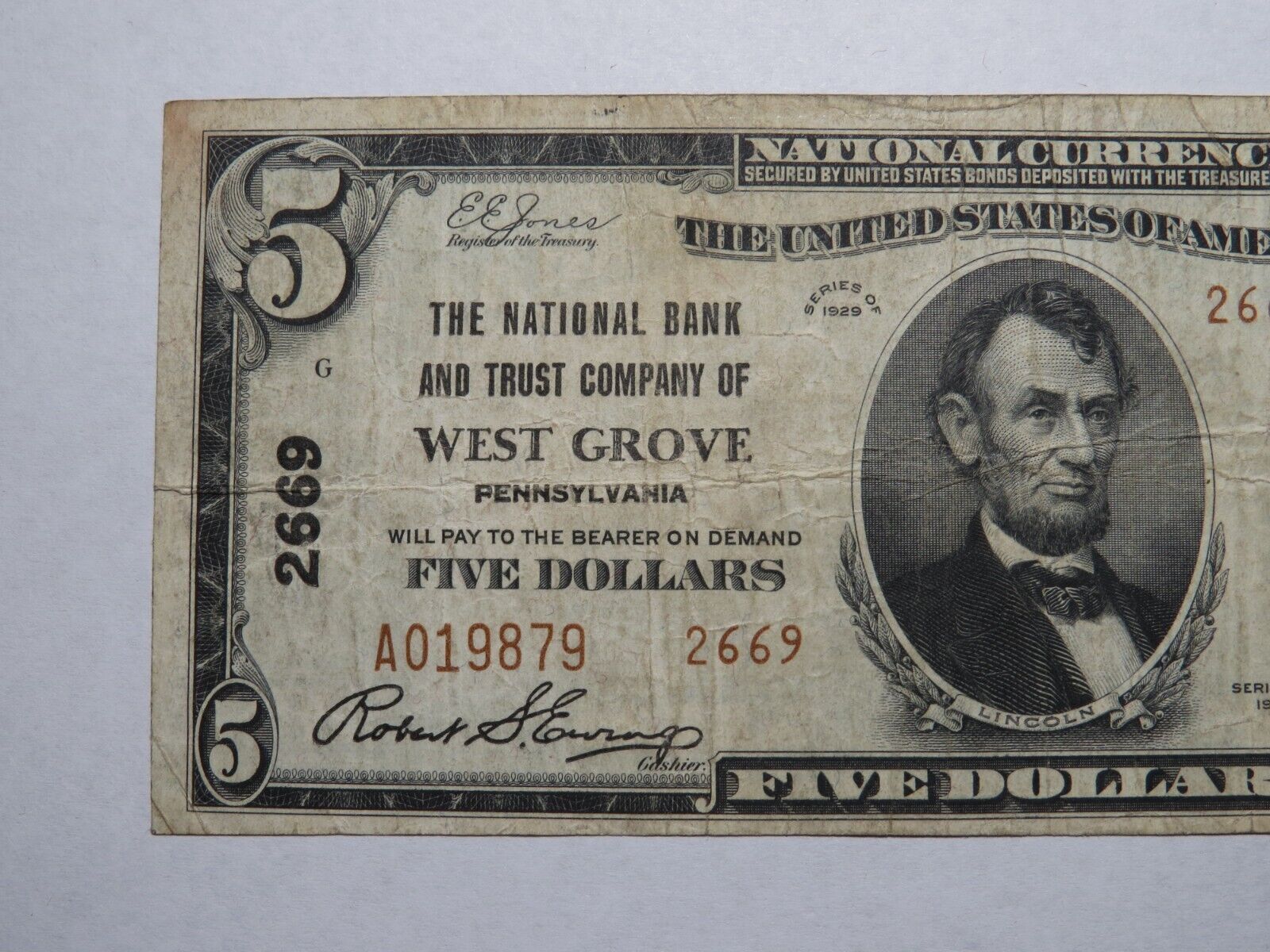 Up for auction is a $5 1929 West Grove Pennsylvania National Currency Note. This note was issued by The National Bank and Trust Company of West Grove. It is Charter #2669. This is a ONE BANK TOWN! This note has a good amount of crisp left to it and is in great shape with no issues. This bill is a must have for any collector of National Currency!