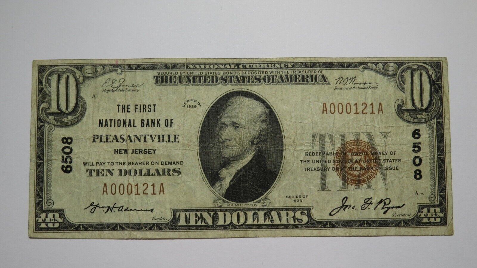 Up for auction is a $10 1929 Pleasantville New Jersey Type 1 National Currency Note. This note was issued by The First National Bank of Pleasantville. It is Charter #6508. Pleasantville is an always in demand NJ town! This note has some good crisp left to it and is in great shape with no issues! It is a great rare bill. This bill is a must have for any collector of National Currency!