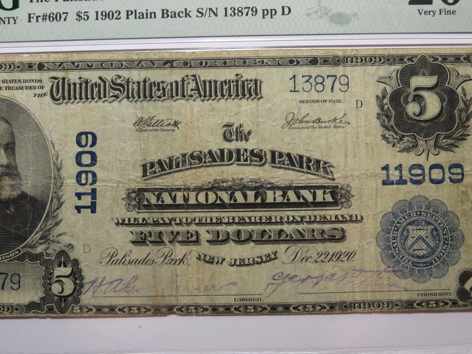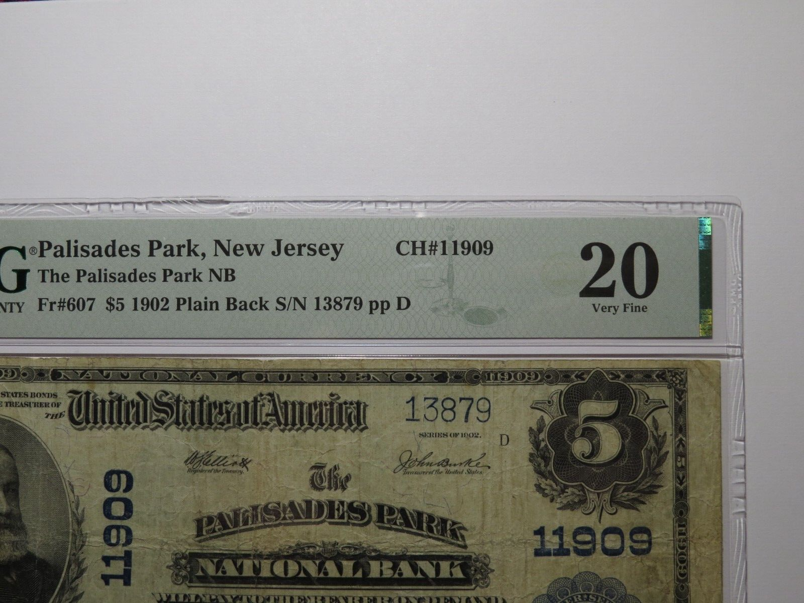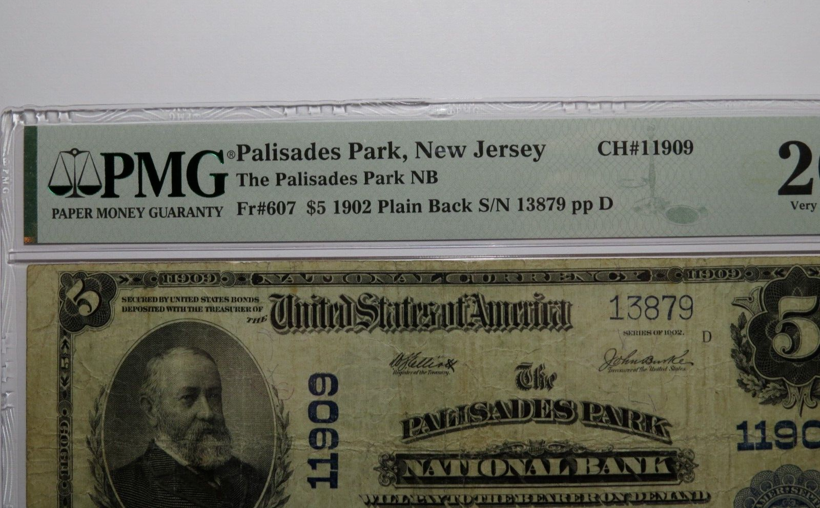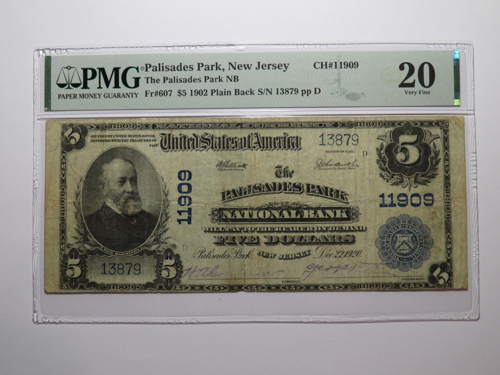 Up for auction is a $5 1902 Palisades Park New Jersey National Currency Note.  This note was issued by The Palisades Park National Bank.  It is Charter #11909.  Palisades Park is a tough to find NJ town!  This note has been graded Very Fine 20 by PMG.  This is a problem free note.  This bill is a must have for any collector of National Currency!