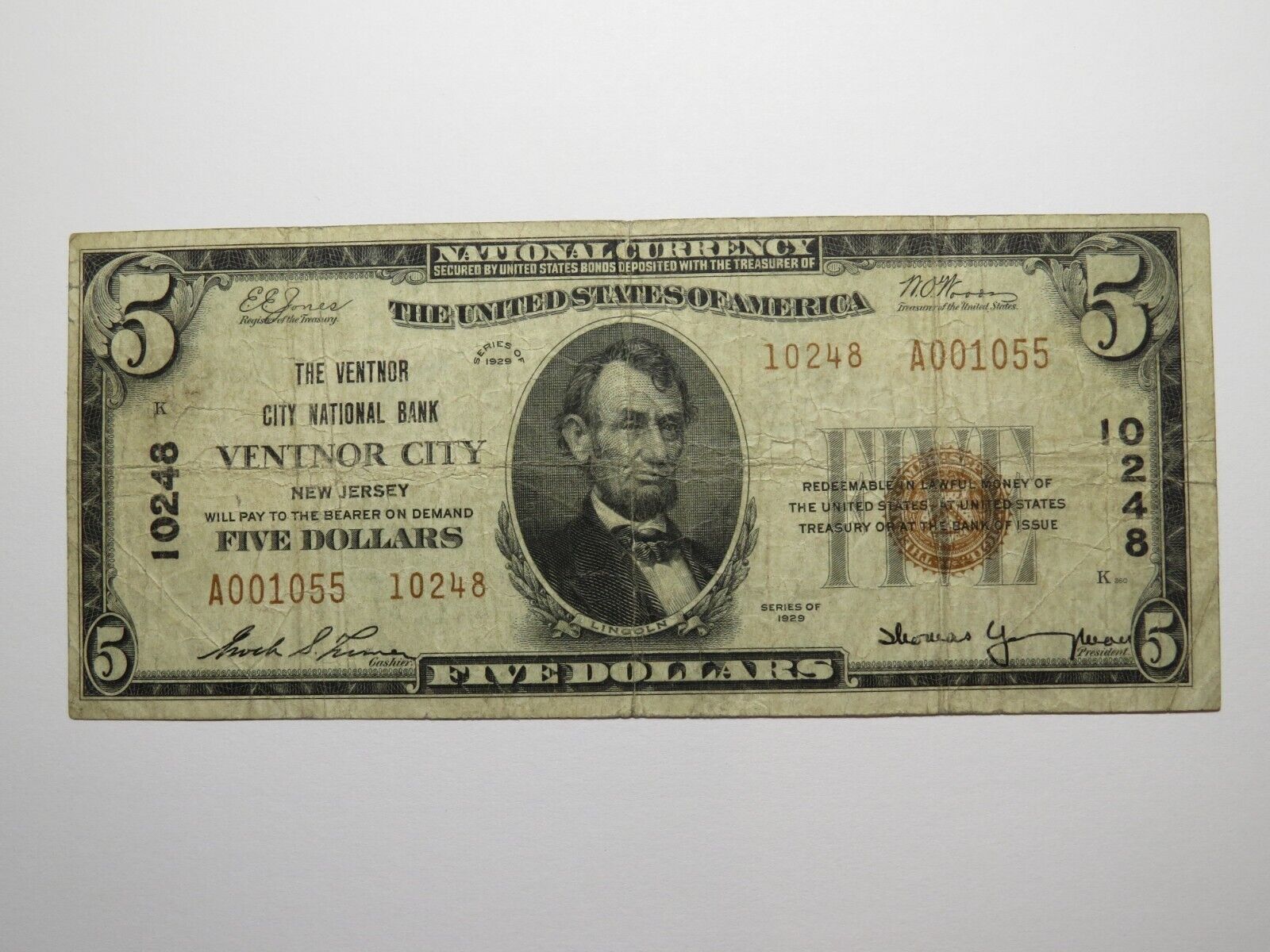 Up for auction is a $5 1929 Ventnor City New Jersey Type 2 National Currency Note. This note was issued by The Ventnor City National Bank. It is Charter #10248. This is a ONE BANK TOWN! This bill has a good amount of crisp left to it and is in good shape with no issues. This bill is a must have for any collector of National Currency!