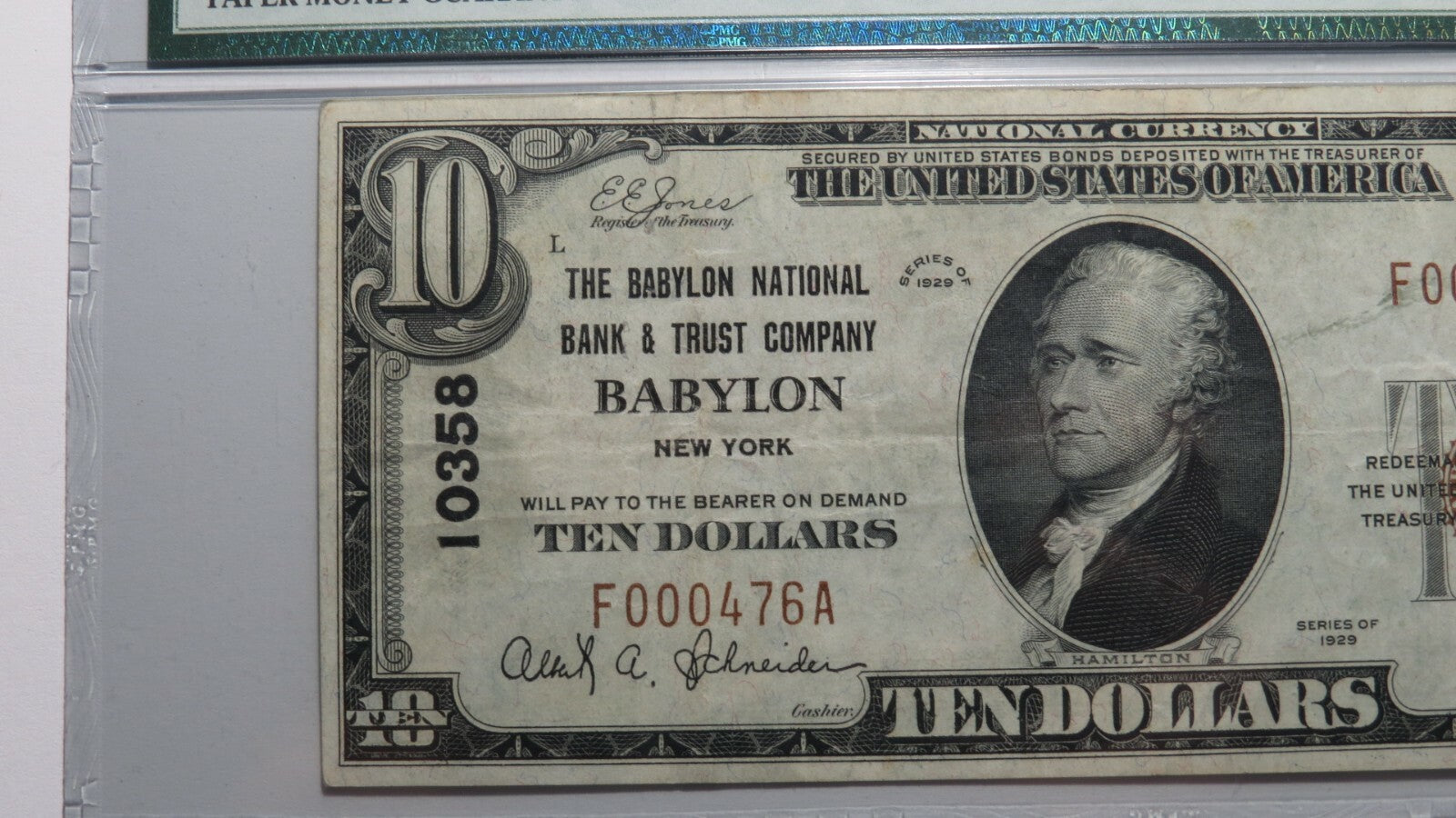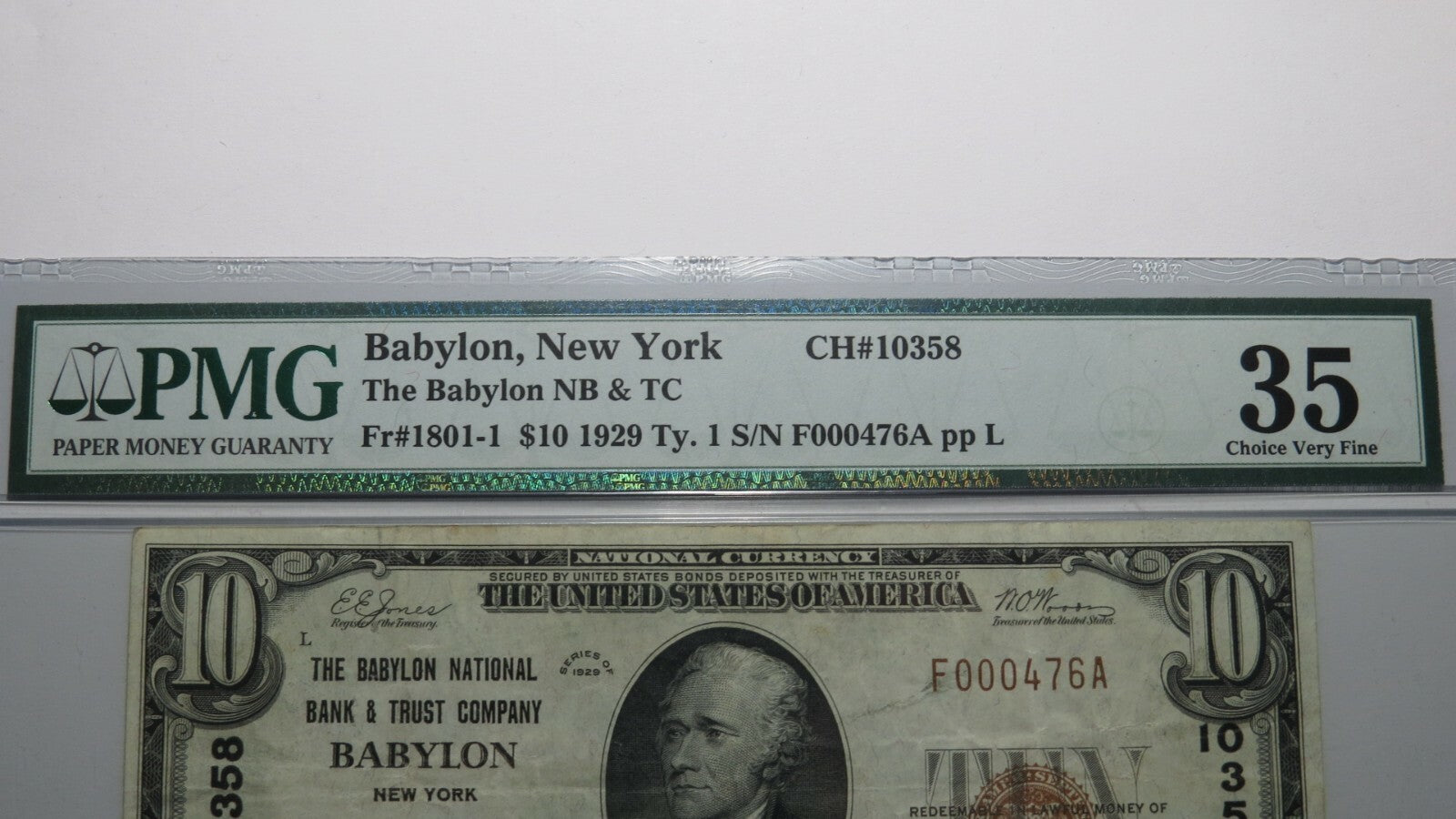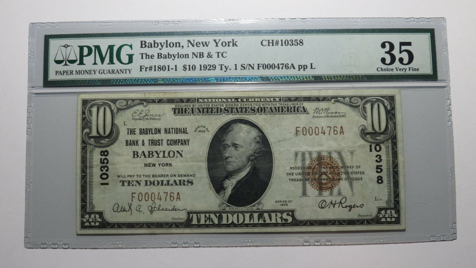 Up for auction is a $10 1929 Babylon New York Type 1 National Currency Note. It is issued from The Babylon National Bank & Trust Company. It is Charter #10358. This is a near IMPOSSIBLE to find New York town you will not see for sale anywhere else! This note has been graded Choice Very Fine 35 by PMG. There is nothing wrong with this note! This bill is a must have for any collector of National Currency!