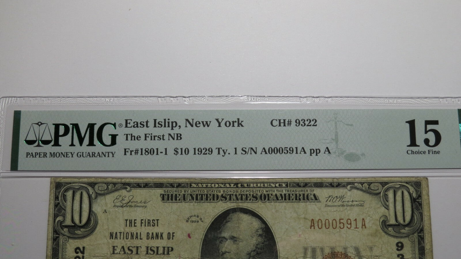 Up for auction is a $10 1929 East Islip New York Type 1 National Currency Note. It is issued from The First National Bank of East Islip. It is Charter #9322. East Islip is a ONE BANK TOWN! This note has been graded Choice Fine 15 by PMG. This bill is a must have for any collector of National Currency!