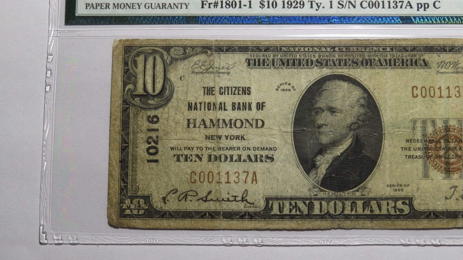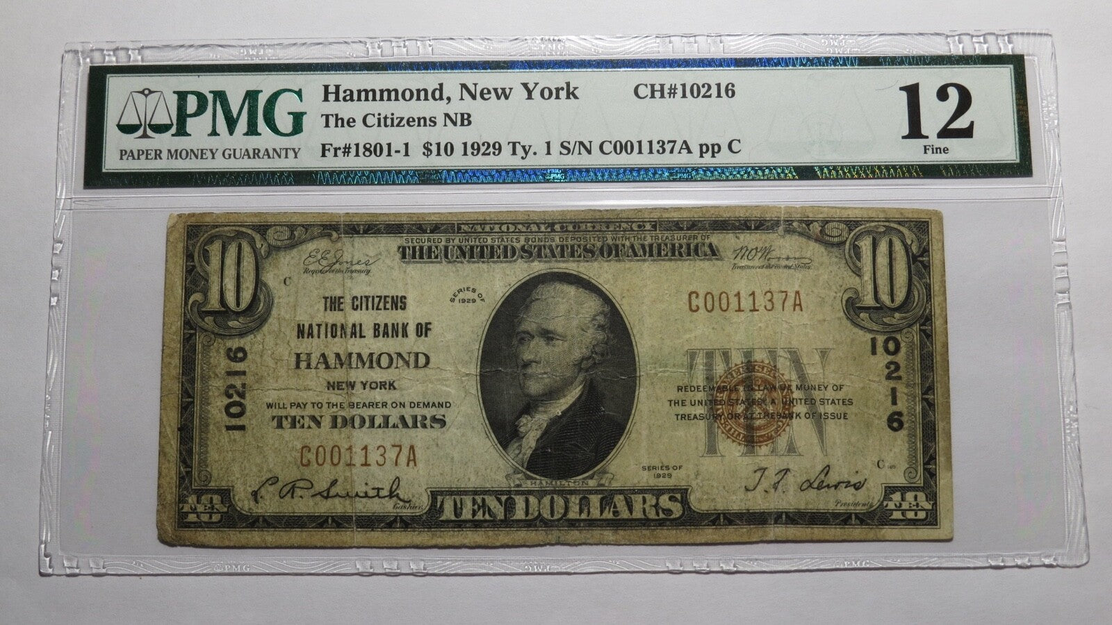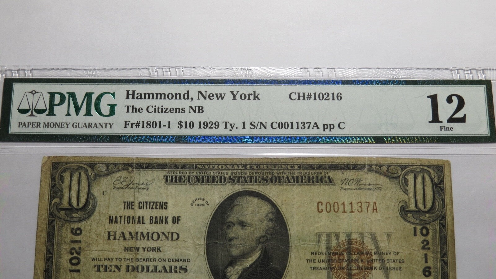 Up for auction is a $10 1929 Hammond New York Type 1 National Currency Note. It is issued from The Citizens National Bank of Hammond. It is Charter #10216. This is a ONE BANK TOWN you will not see for sale anywhere else! This note is graded Fine 12 by PMG. This bill is a must have for any collector of National Currency!