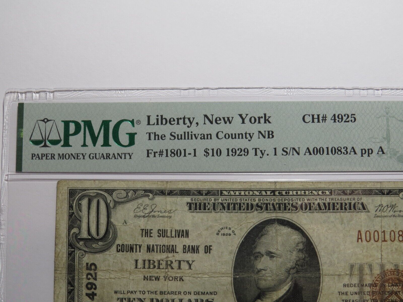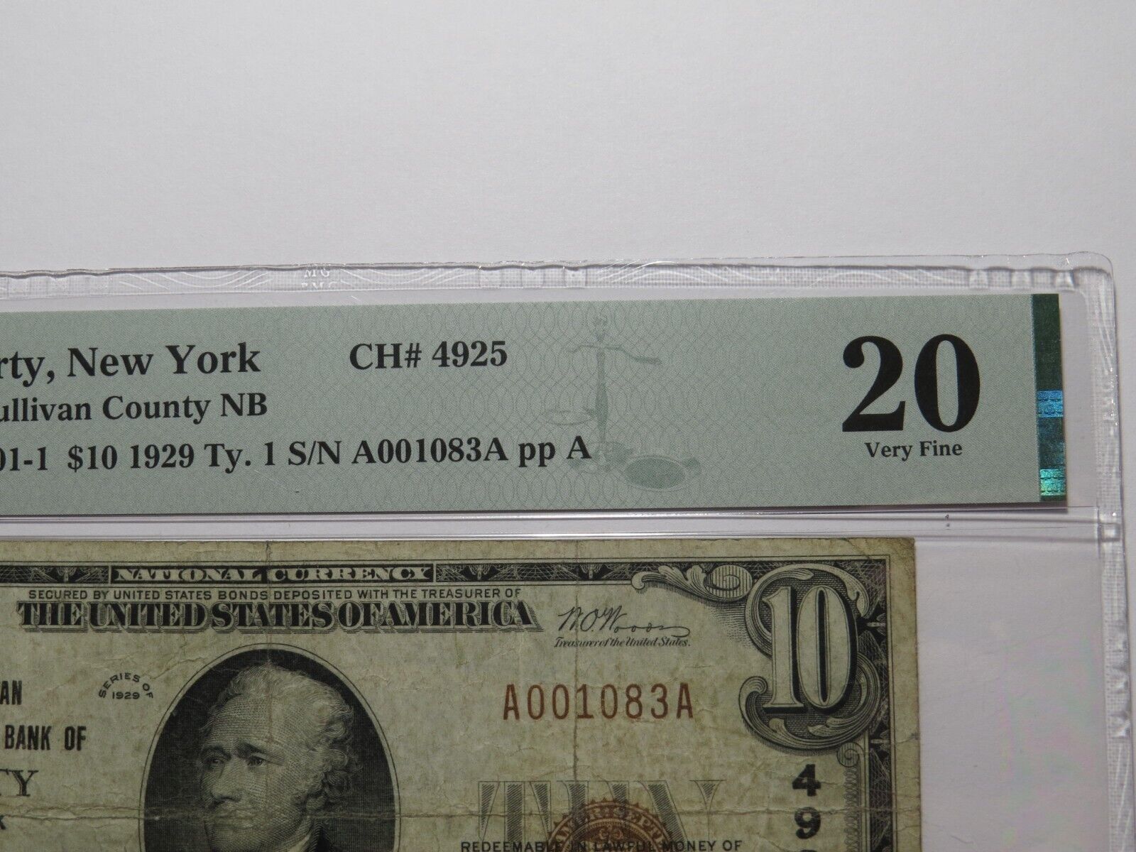 Up for auction is a $10 1929 Liberty New York Type 1 National Currency Note. This note was issued by The Sullivan County National Bank of Liberty. It is Charter #4925. Liberty is a tough to find New York town! This note has been graded Very Fine 20 by PMG. This is a problem free note. This bill is a must have for any collector of National Currency!