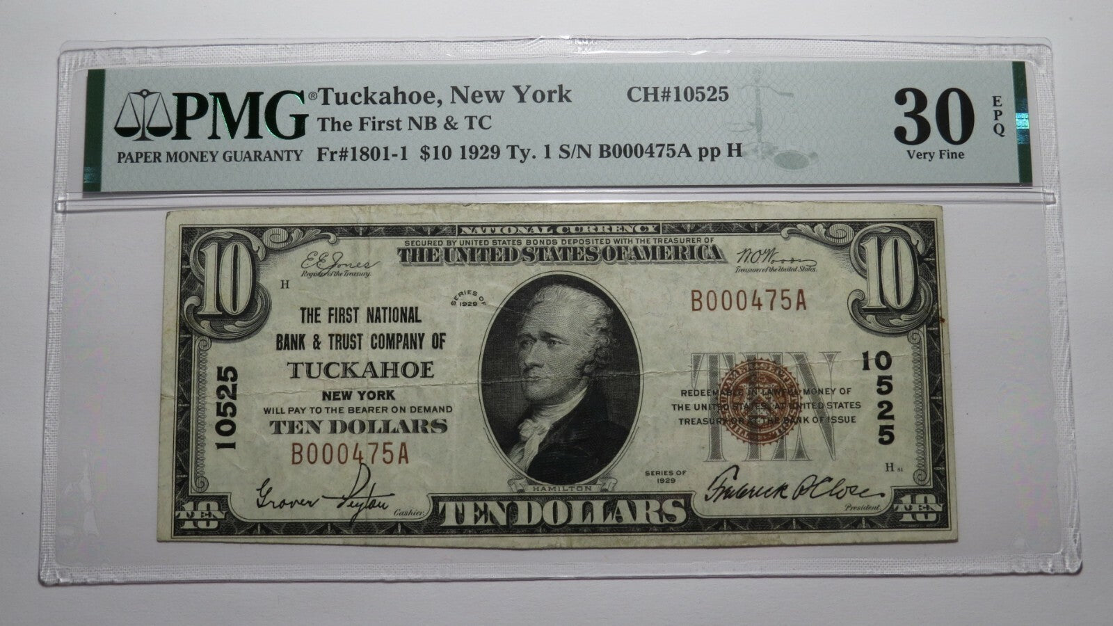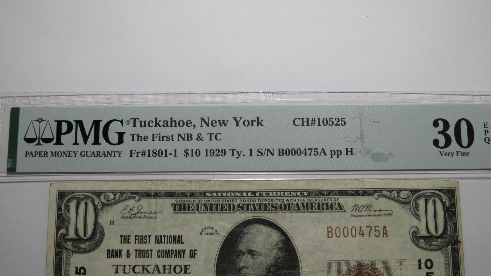 Up for auction is a $10 1929 Tuckahoe New York Type 1 National Currency Note. It is issued from The First National Bank & Trust Company of Tuckahoe. It is Charter #10525. Tuckahoe is an always in demand New York town! This note has been graded Very Fine 30EPQ by PMG. There is nothing wrong with this note, it is a stunning bill. This bill is a must have for any collector of National Currency!