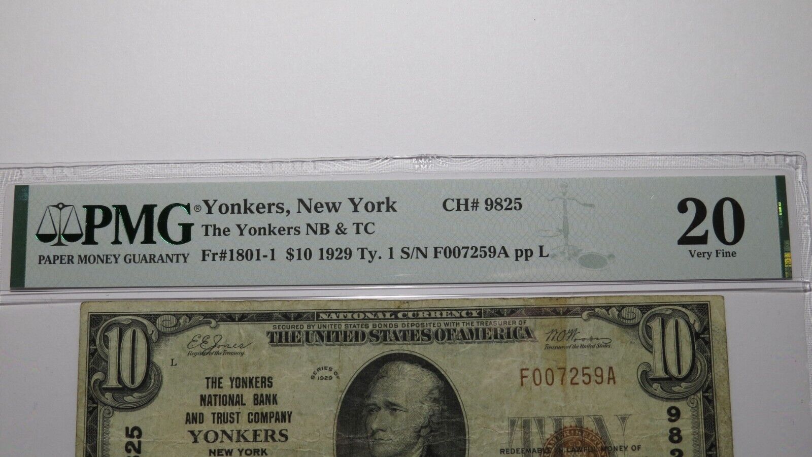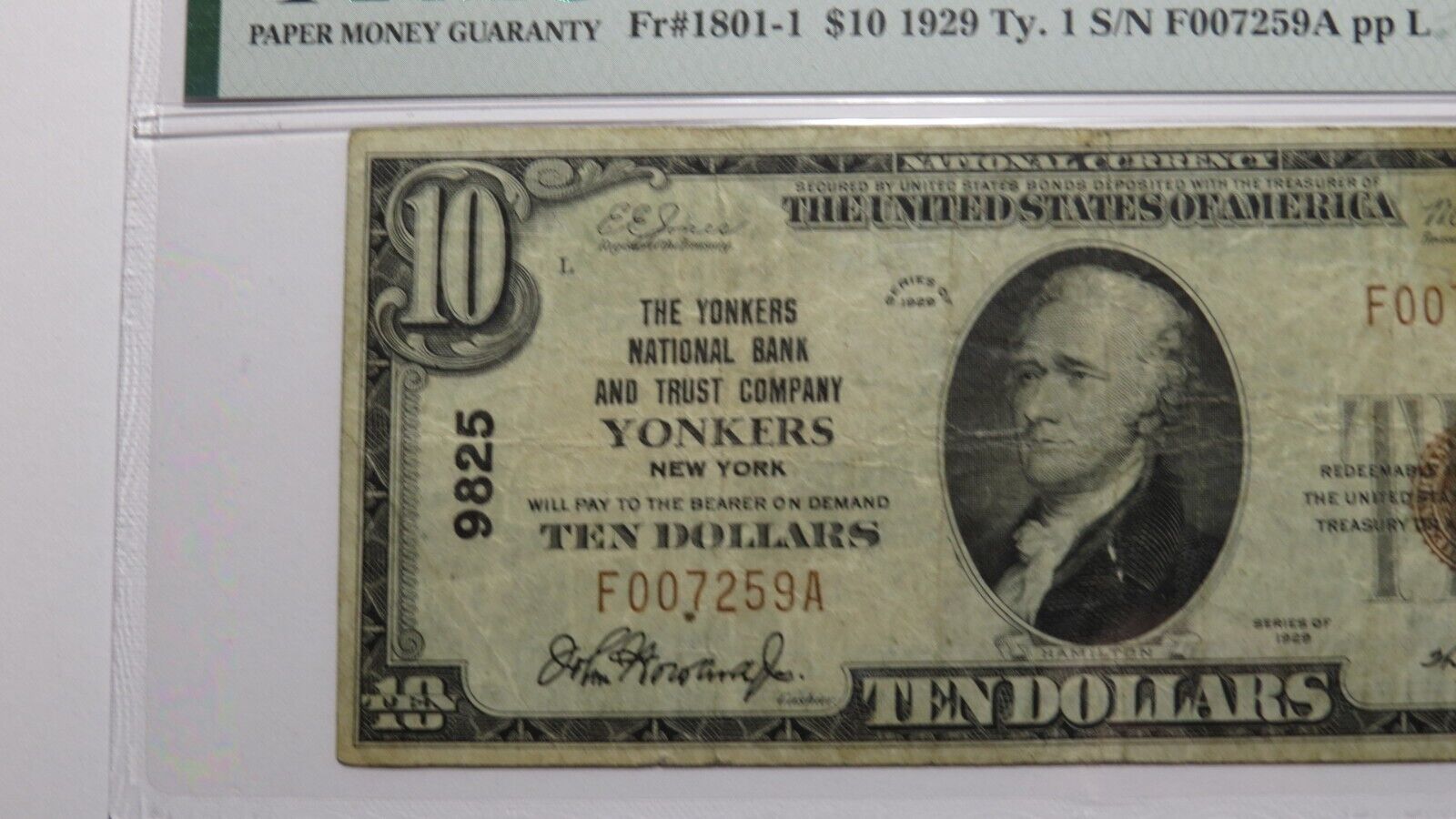 Up for auction is a $10 1929 Yonkers New York Type 1 National Currency Note. It was issued from The Yonkers National Bank and Trust Company. It is Charter #9825. Yonkers is an always in demand NY town! This bill has been graded Very Fine 20 by PMG. This is a problem free note! This bill is a must have for any collector of National Currency!