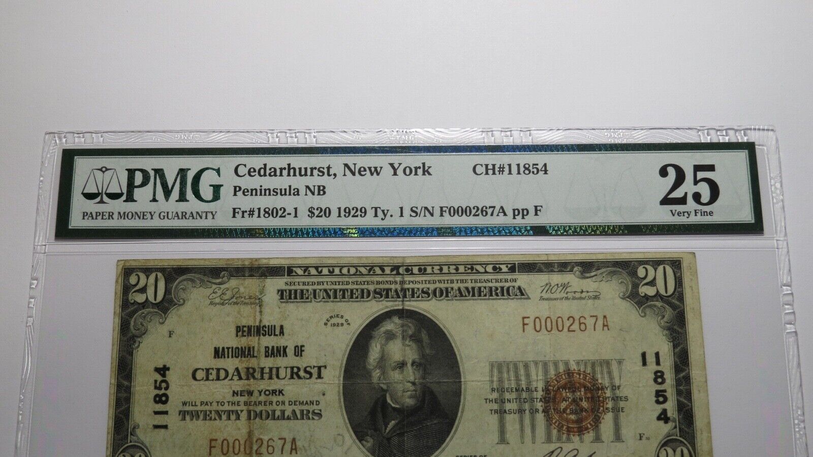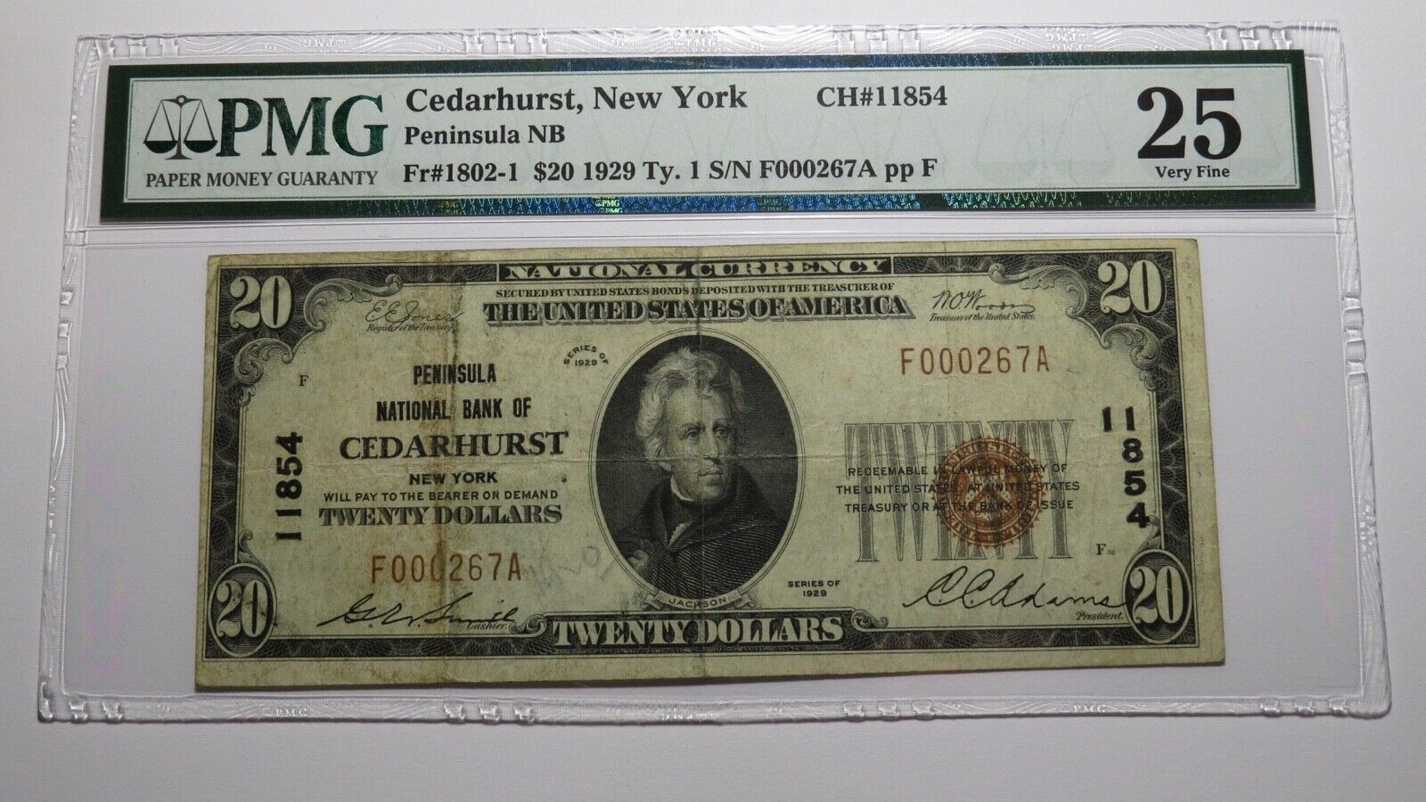 .  It is issued from The Peninsula National Bank of Cedarhurst. It is Charter #11854.  This is a ONE BANK TOWN!  This note is graded Very Fine 25 by PMG!  This bill is a must have for any collector of National Currency!