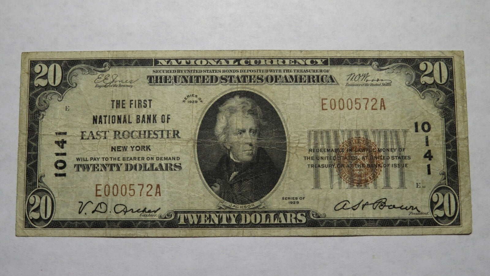 Up for auction is a $20 1929 East Rochester New York National Currency Note. It is issued from The First National Bank of East Rochester. It is Charter #10141. This is a ONE BANK TOWN you will not find anywhere else! This note has a good amount of crisp left to it and is in great shape with zero issues! This bill is a must have for any collector of National Currency!