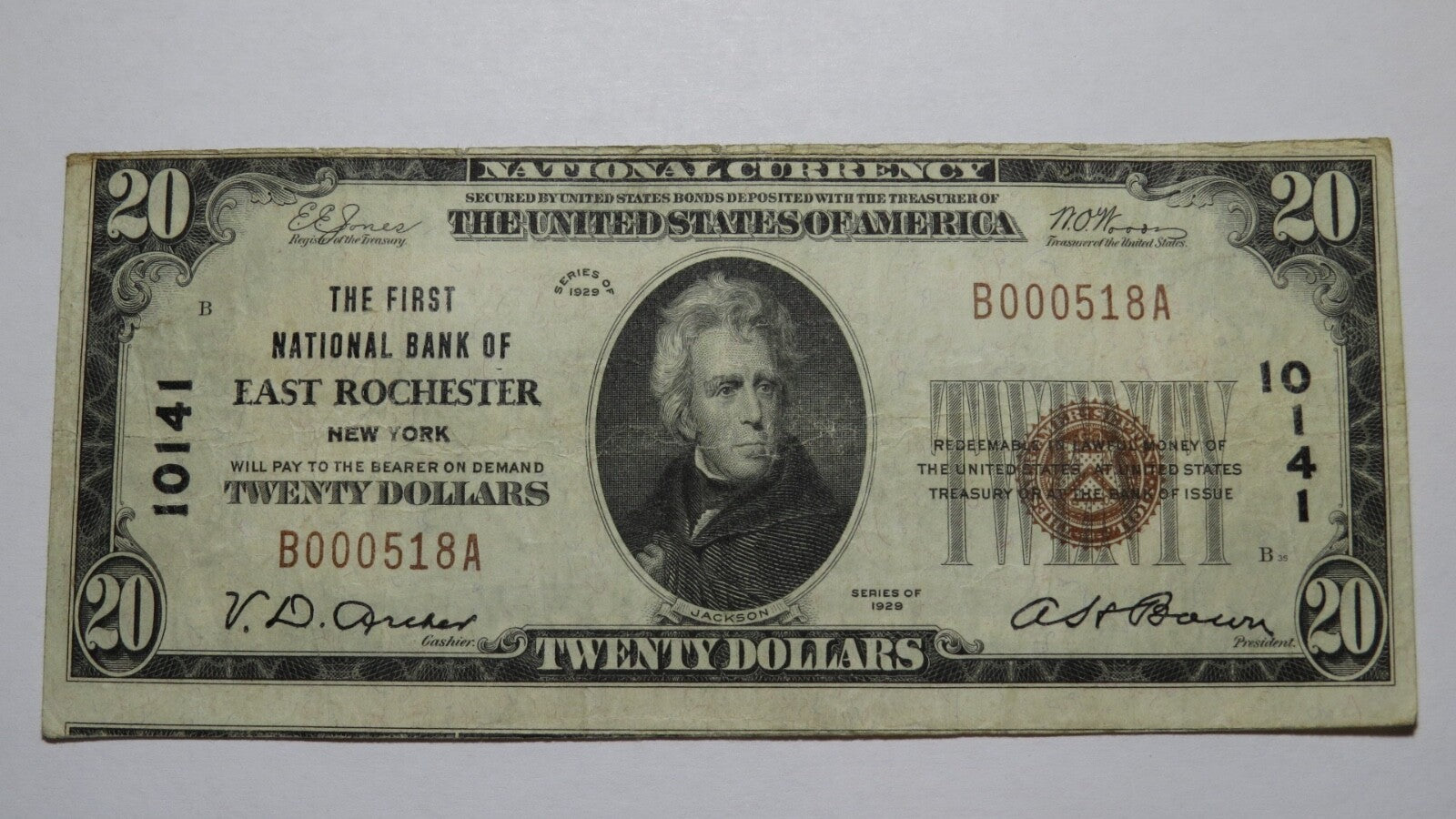 Up for auction is a $20 1929 East Rochester New York National Currency Note.  It is issued from The First National Bank of East Rochester.  It is Charter #10141.  This is a ONE BANK TOWN you will not find anywhere else! This note has a good amount of crisp left to it and is in great shape with zero issues!  This bill is a must have for any collector of National Currency!