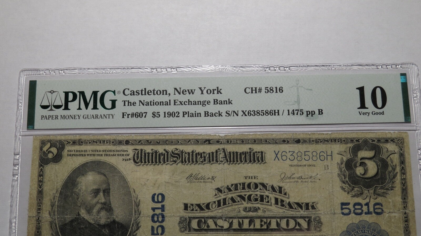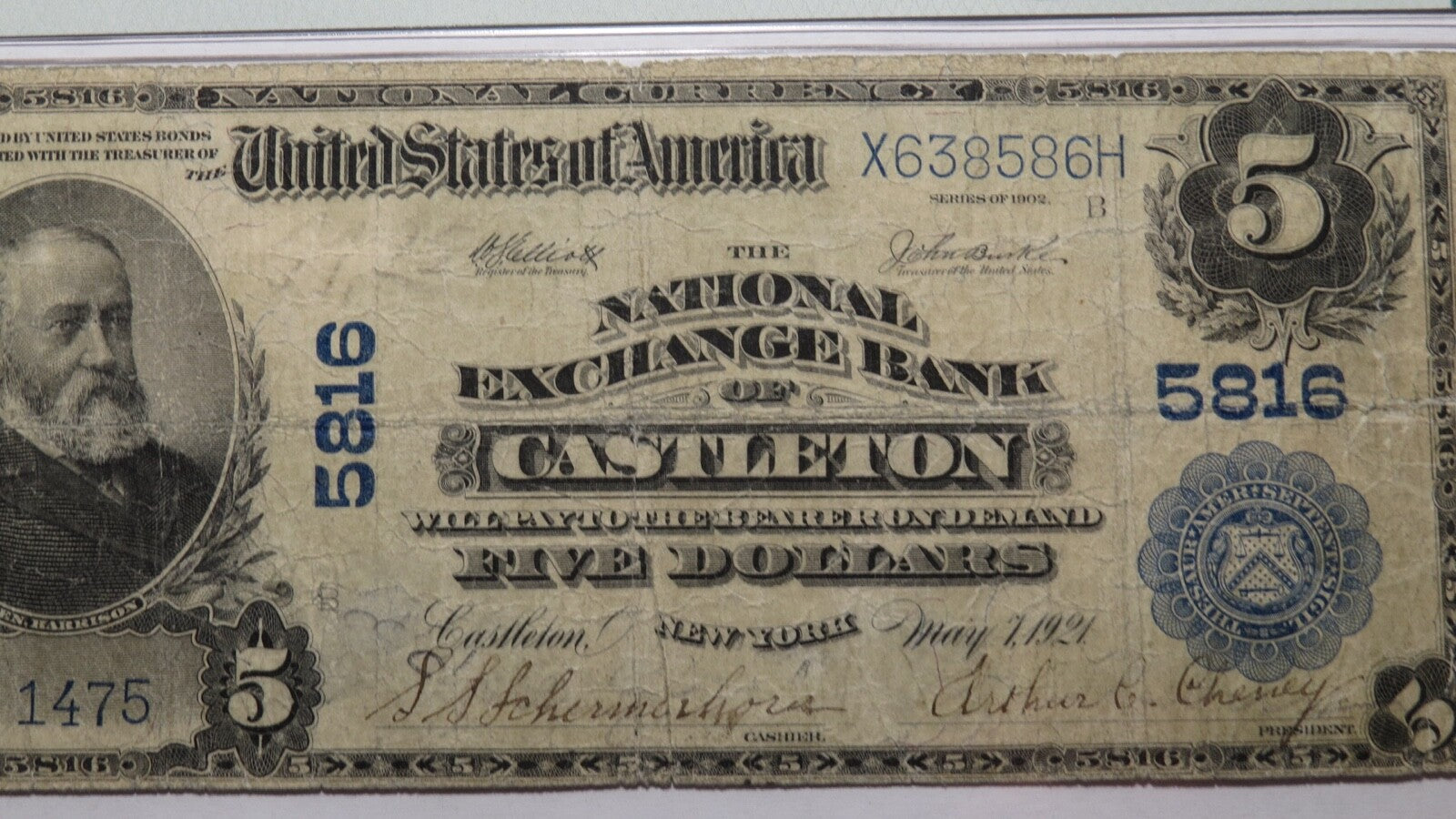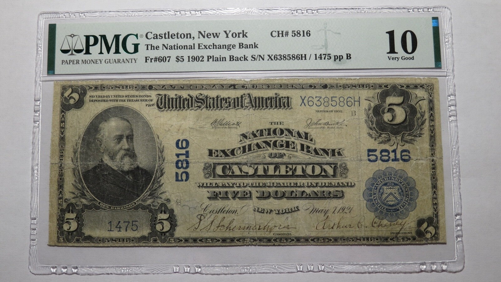 Up for auction is a $5 1902 Castleton New York Plain Back National Currency Note. It is issued from The National Exchange Bank of Castleton. It is Charter #5816. Castleton is a near IMPOSSIBLE to find New York town! This note is graded Very Good 10 by PMG. It is noted that there is a repair, however it is hardly noticeable. This bill is a must have for any collector of National Currency!