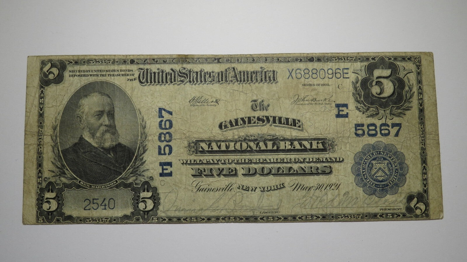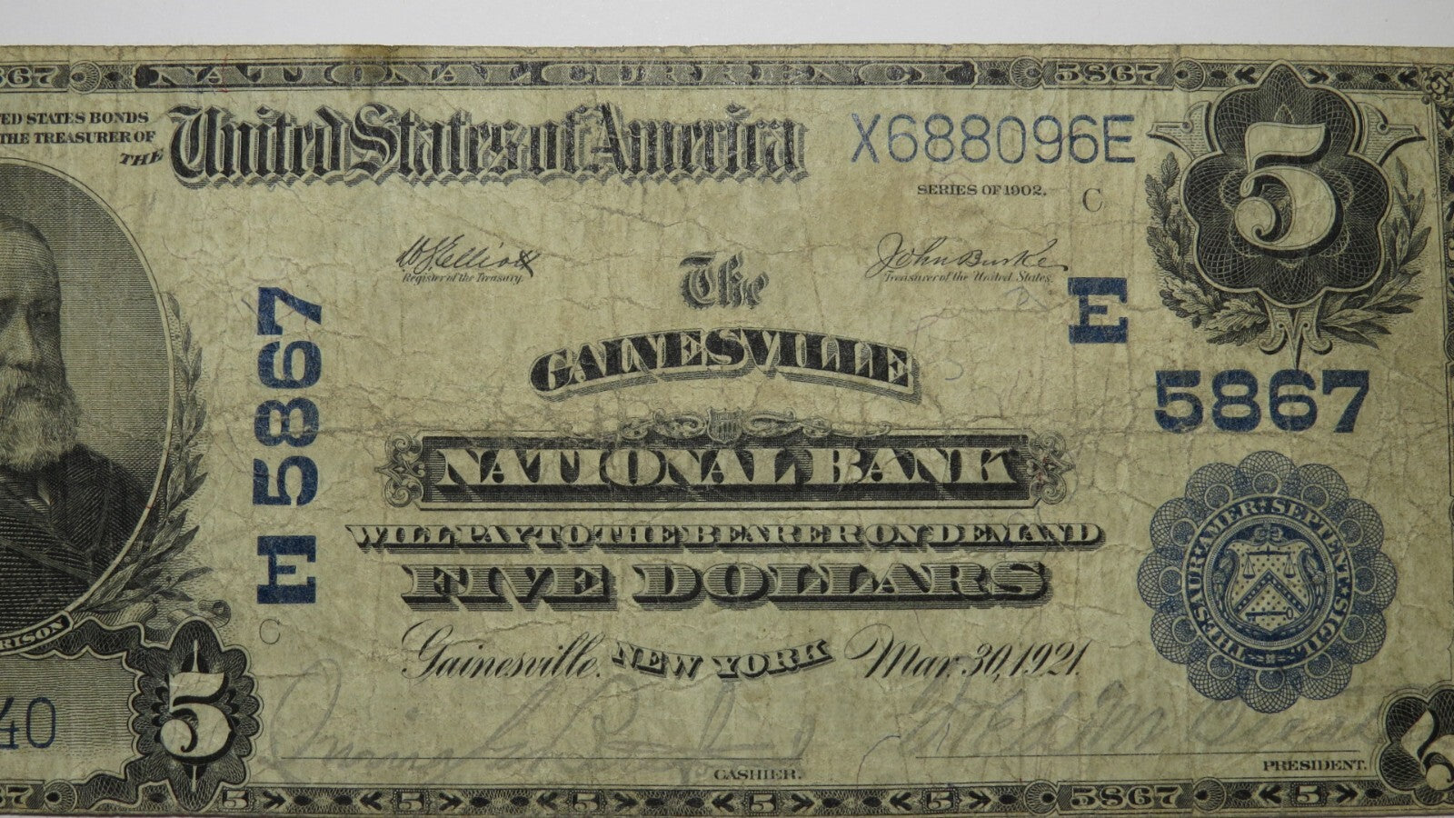 Up for auction is a $5 1902 Gainesville New York National Currency Note.  This note was issued from The Gainesville National Bank.  It is Charter #5867. This is a ONE BANK TOWN you will not find anywhere else!  This bill still has a good amount of crisp to it and is in good shape with zero issues.  This bill is a must have for any collector of National Currency!