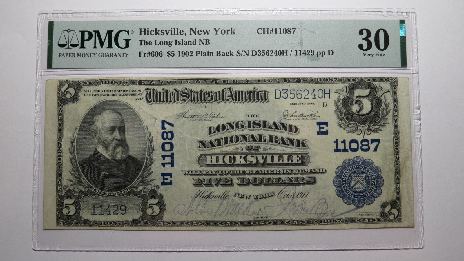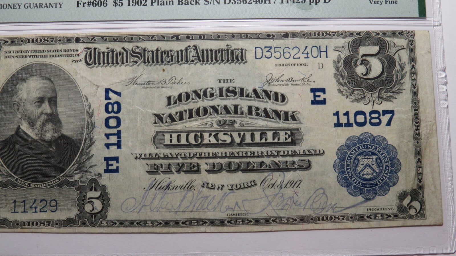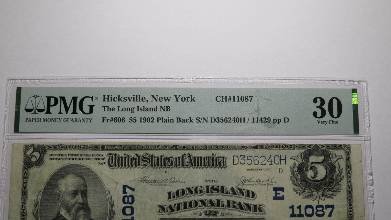 $5 1902 Hicksville New York NY National Currency Bank Note Bill #11087 VF30 PMG