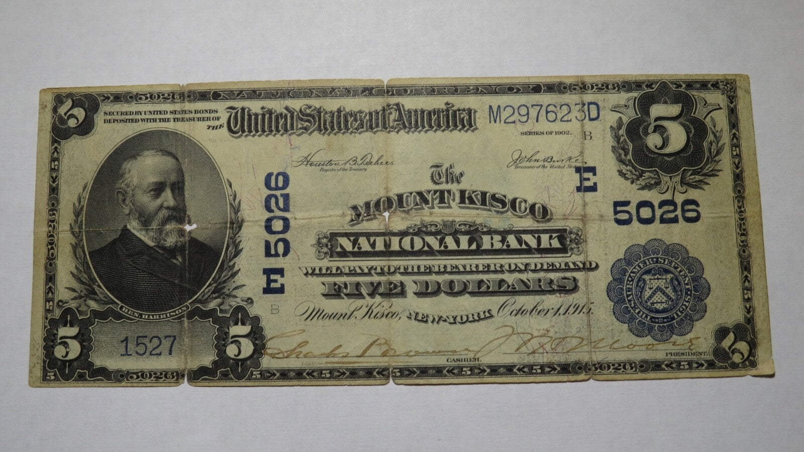 Up for auction is a $5 1902 Mount Kisco New York National Currency Note. It is issued from The Mount Kisco National Bank. It is Charter #5026. This is a ONE BANK TOWN! This bill has some good crisp to it, but does have several deep folds and a couple minor internal split. Overall, it is a nice example from a hard to find town. This bill is a must have for any collector of National Currency!