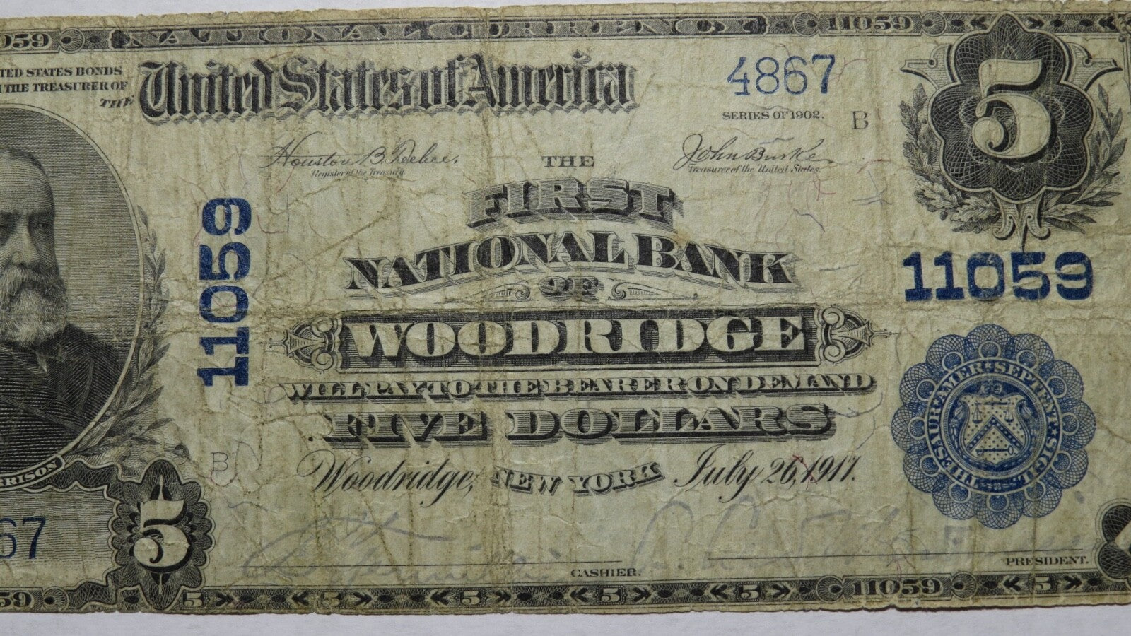 Up for auction is a $5 1902 Woodridge New York National Currency Note. It is issued from The First National Bank Of Woodridge. It is Charter #11059. This is a ONE BANK TOWN you will not find anywhere else! Bill still has some good crisp to it and is in great shape with zero issues! This bill is a must have for any collector of National Currency!