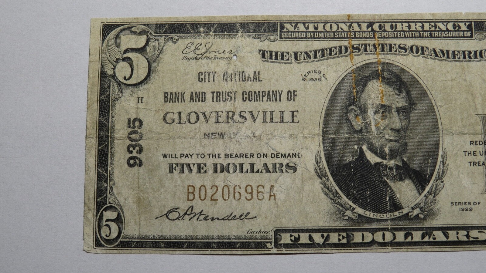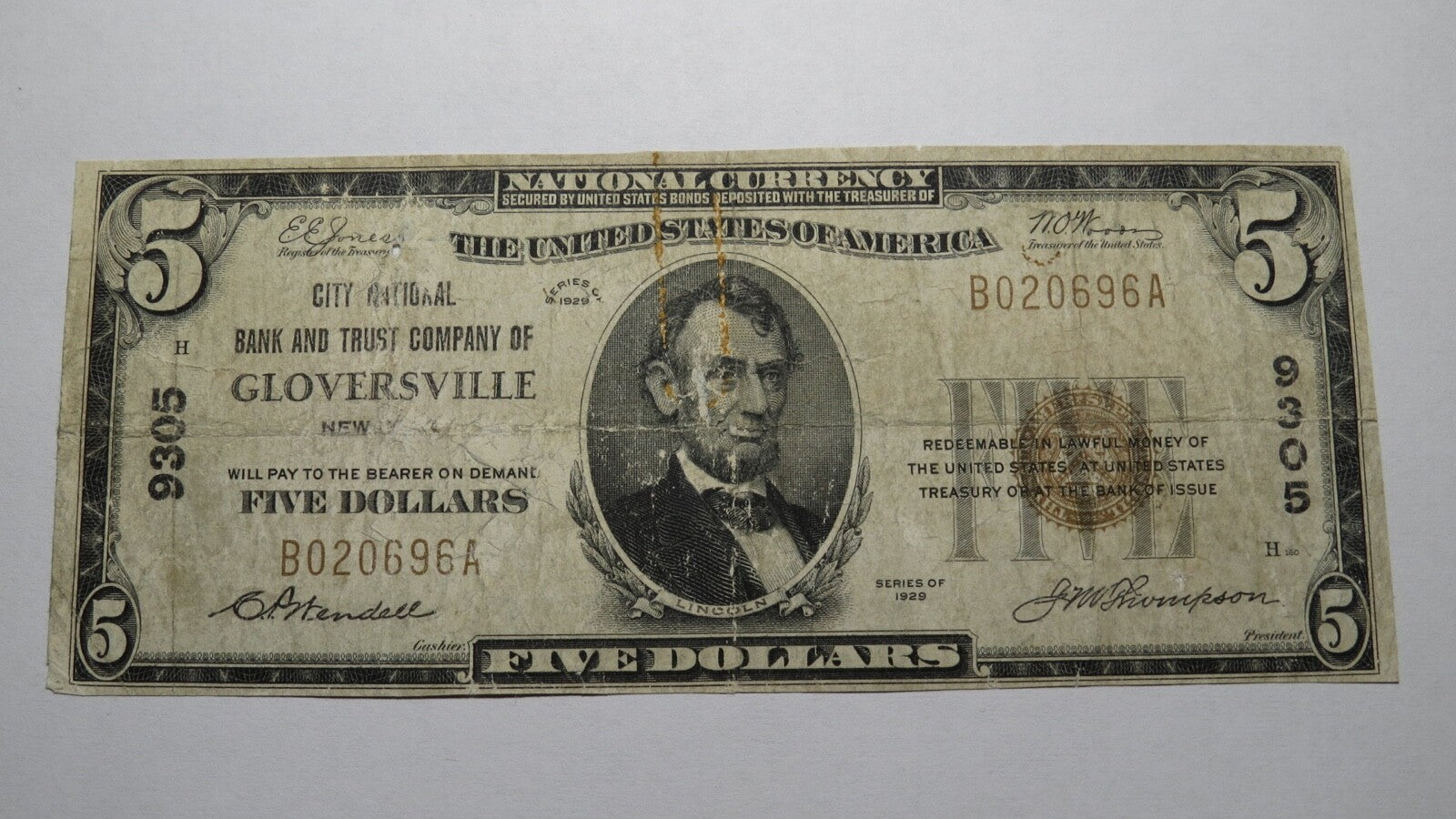 Up for auction is a $5 1929 Gloversville New York Type 1 National Currency Note.  It is issued from The City National Bank and Trust Company of Gloversville.  It is Charter #9305.  Gloversville is an always in demand New York town!  This note still has a good amount of crisp left to it and is in good, but well circulated shape.  This bill is a must have for any collector of National Currency!