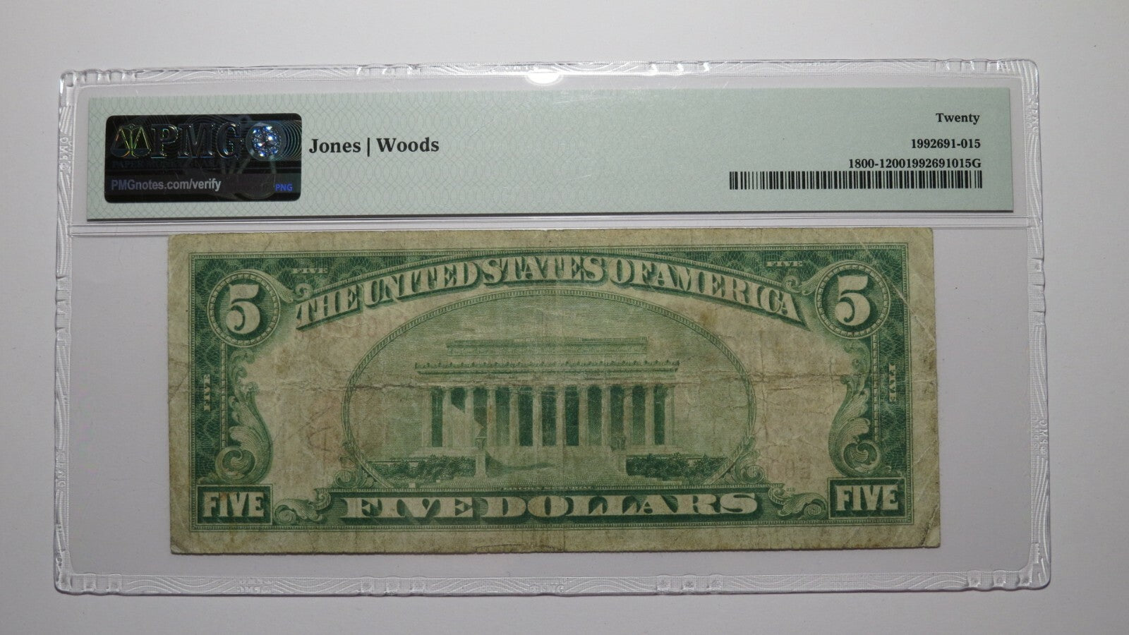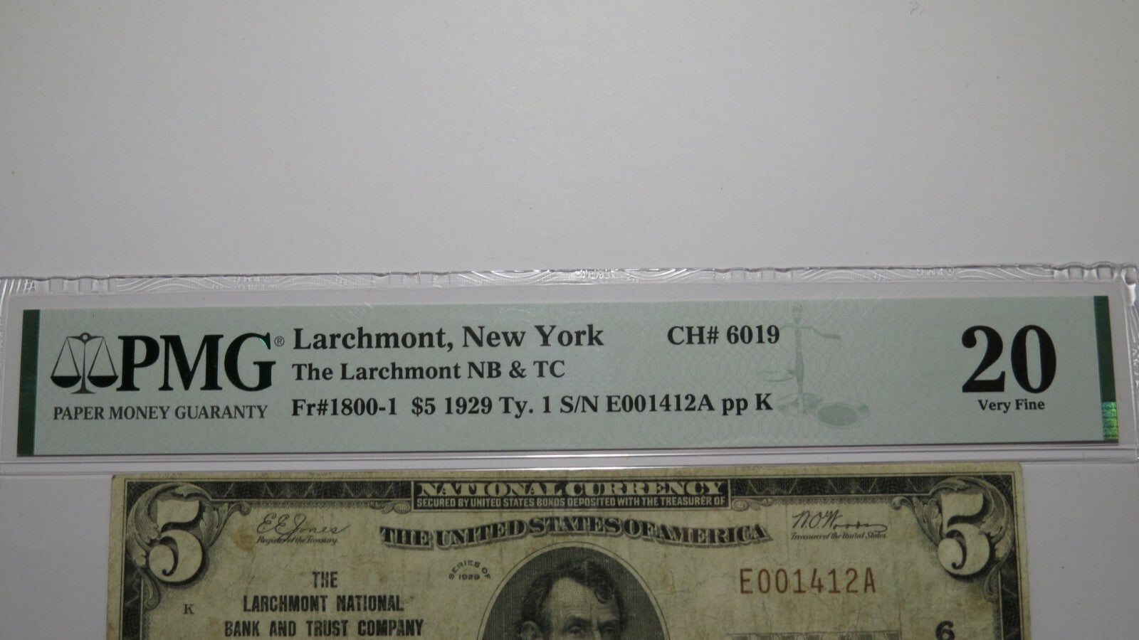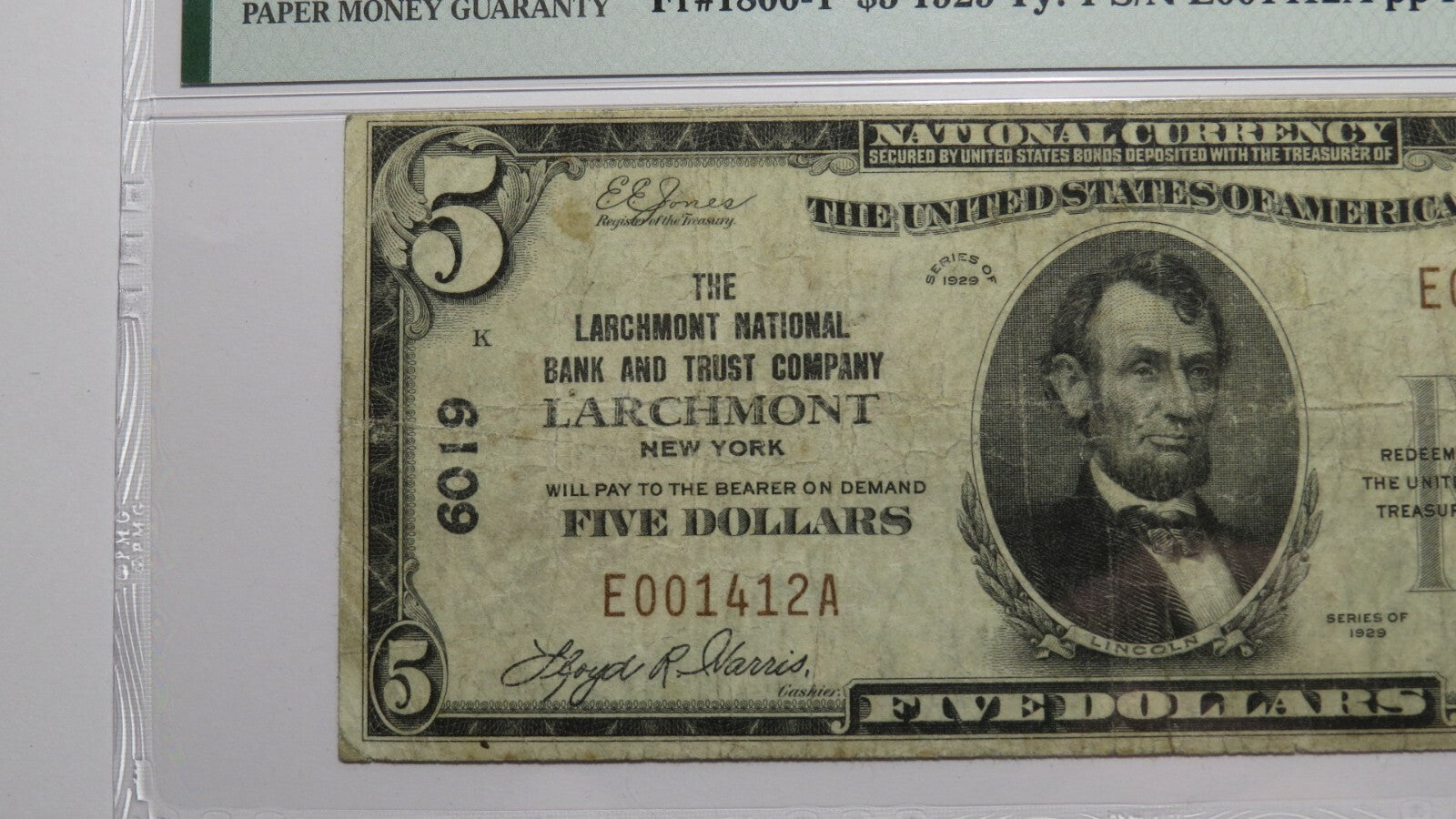 Up for auction is a $5 1929 Larchmont New York Type 1 National Currency Note. It is issued from The Larchmont National Bank And Trust Company. It is Charter #6019. This is a ONE BANK TOWN you will not find anywhere else! This note has been graded Very Fine 20 by PMG. There is nothing wrong with this note! This bill is a must have for any collector of National Currency!