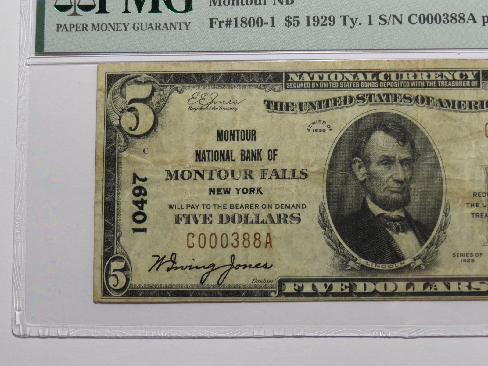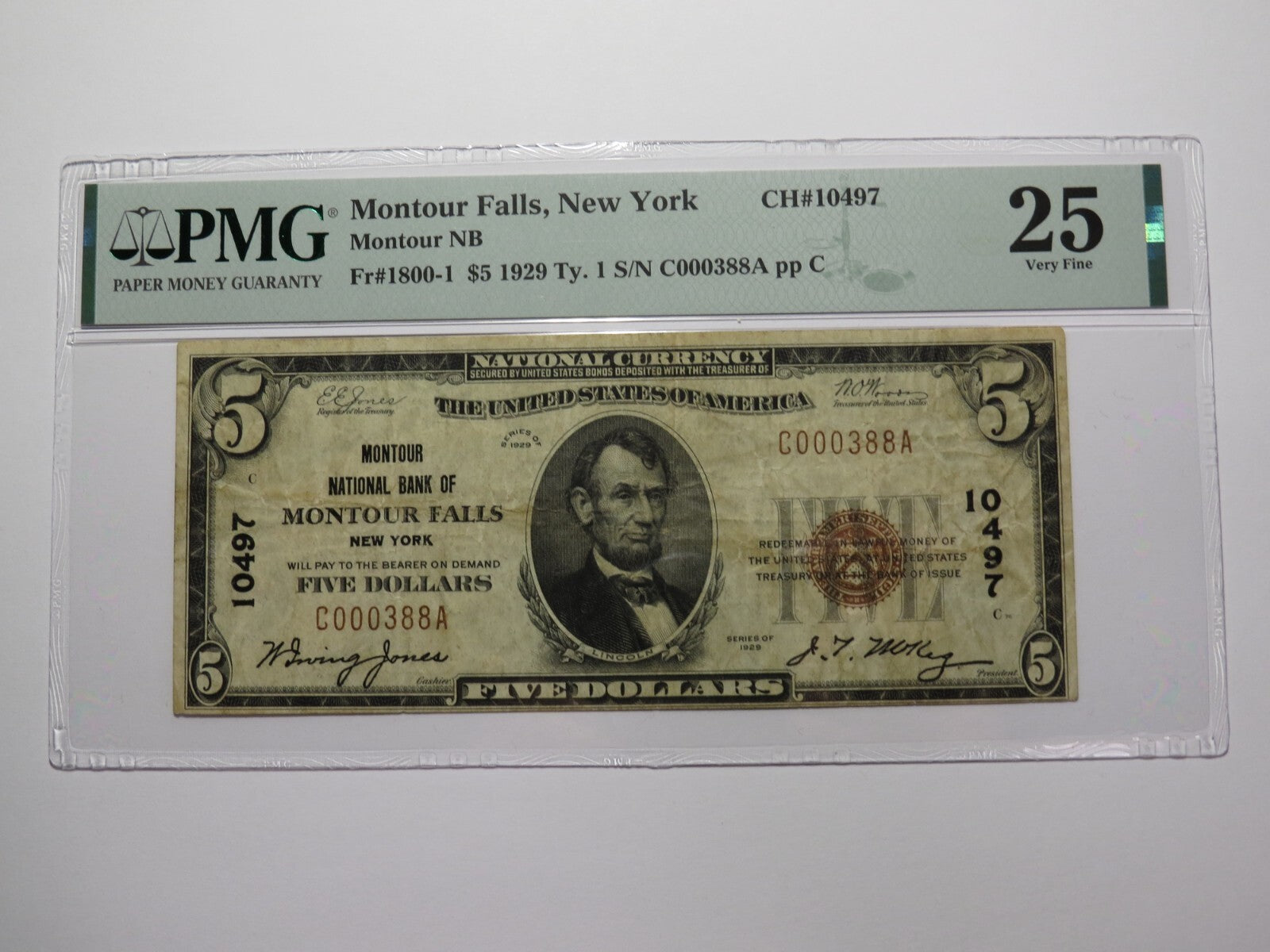 Up for auction is a $5 1929 Montour Falls New York Type 1 National Currency Note. This note was issued by The Montour National Bank of Montour Falls. It is Charter #10497. This is an IMPOSSIBLE to find New York town with less than 10 small size notes known! This note has been graded Very Fine 25 by PMG. This is a problem free note. This bill is a must have for any collector of National Currency!