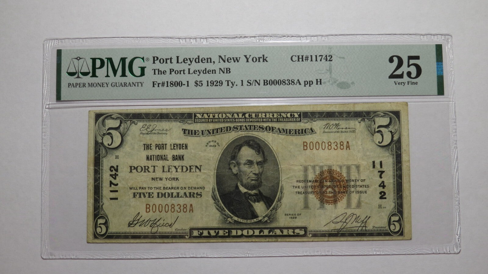 Up for auction is a $5 1929 Port Leyden New York Type 1 National Currency Note.  It is issued from The Port Leyden National Bank.  It is Charter #11742.  This is a ONE BANK TOWN that is impossible to find!  This bill has been graded Very Fine 25 by PMG.  There is nothing wrong with this note!  This bill is a must have for any collector of National Currency!