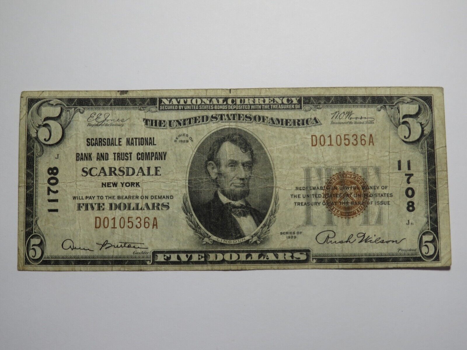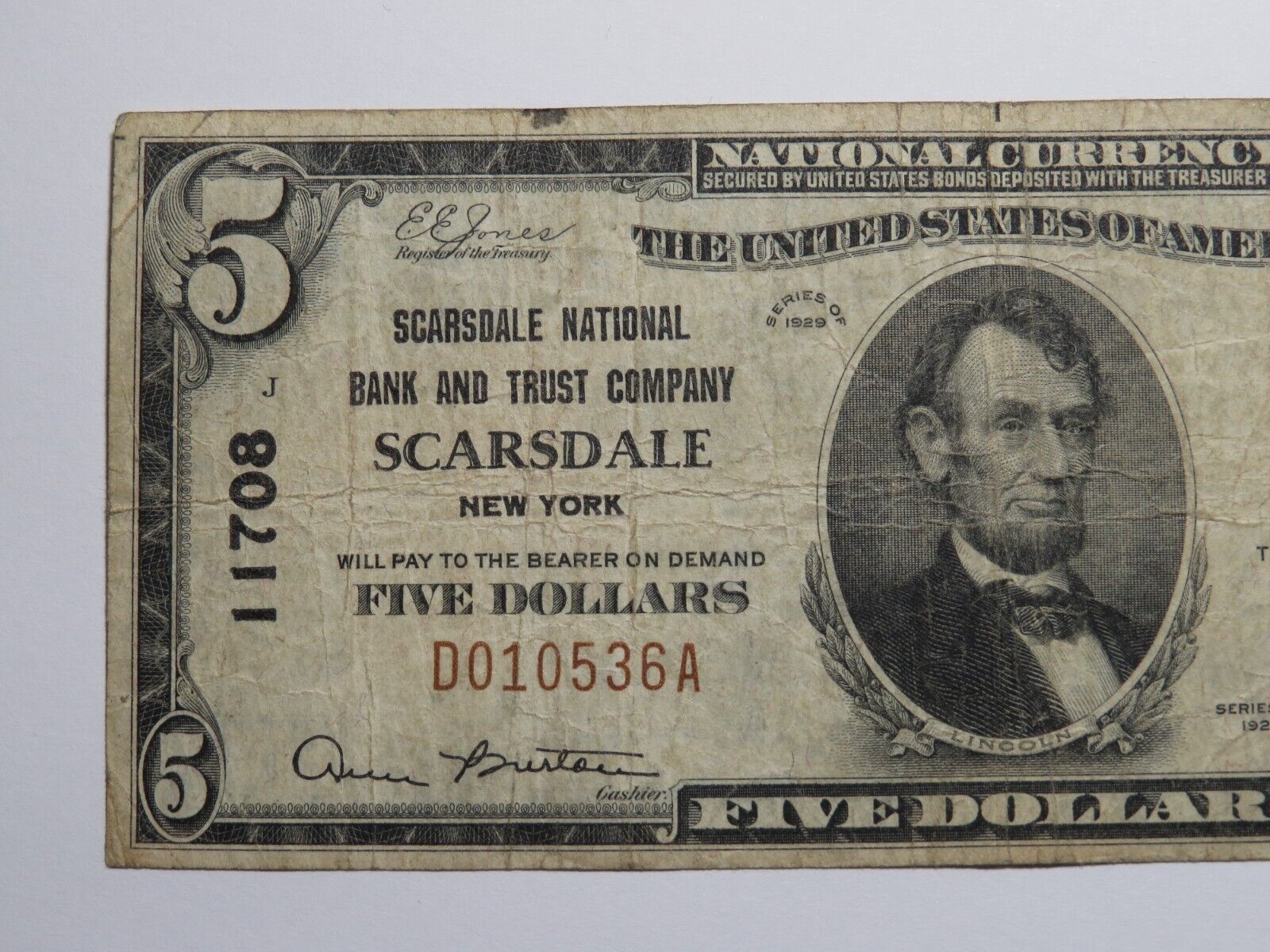 Up for auction is a $5 1929 Scarsdale New York Type 1 National Currency Note. This note was issued by The Scarsdale National Bank and Trust Company. It is Charter #11708. Scarsdale is a tough to find New York town! This note has some good crisp left to it and is in good condition with no issues. This bill is a must have for any collector of National Currency!