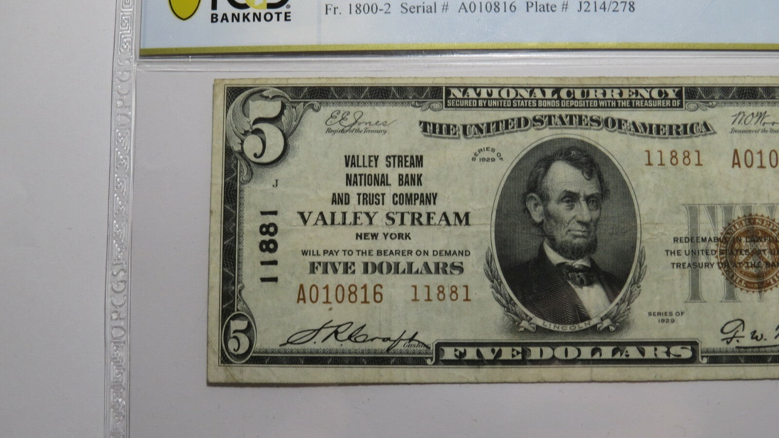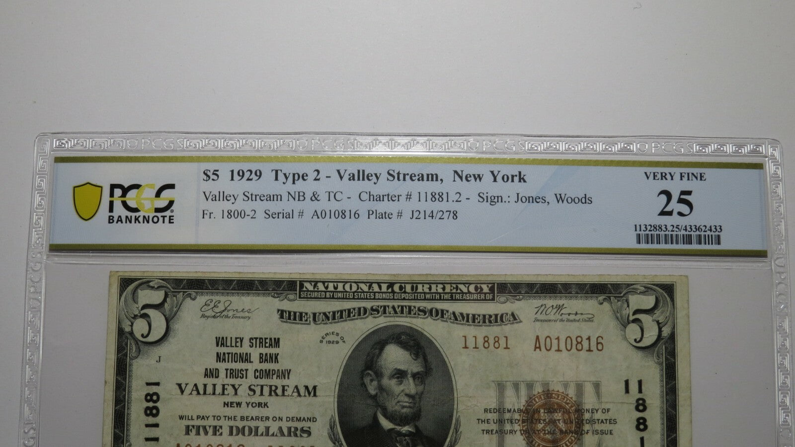 Up for auction is a $5 1929 Valley Stream New York Type 2 National Currency Note. It is issued from The Valley Stream National Bank and Trust Company. It is Charter #11881. This is a ONE BANK TOWN you will not find anywhere else! This note has been graded Very Fine 25 by PCGS. There is nothing wrong with this note! This bill is a must have for any collector of National Currency!