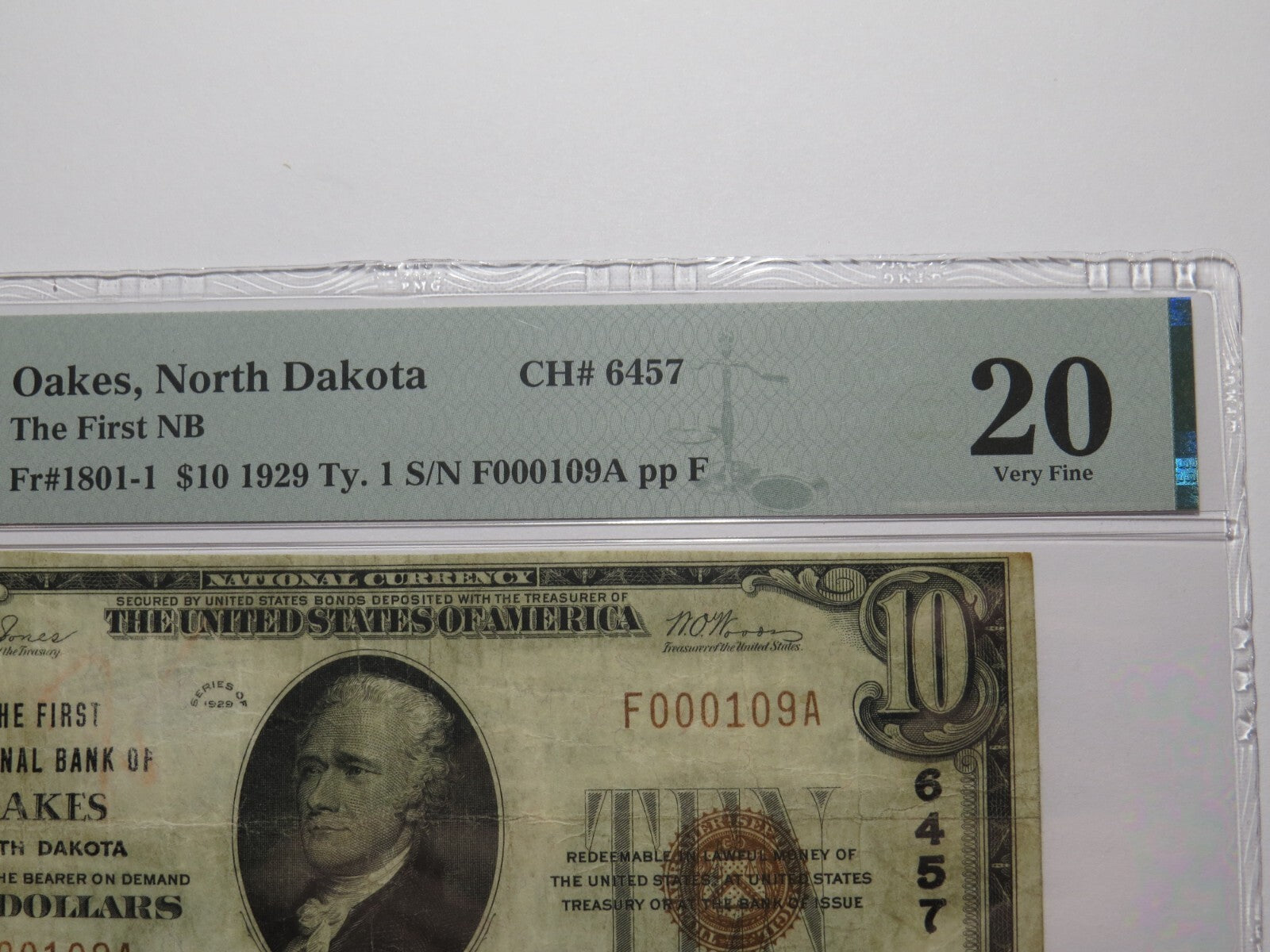 Up for auction is a $10 1929 Oakes North Dakota Type 1 National Currency Note. This note was issued by The First National Bank of Oakes. It is Charter #6457. Oakes is a near IMPOSSIBLE to find North Dakota town! This note has been graded Very Fine 20 by PMG. This bill is a must have for any collector of National Currency. If you have any questions please feel free to ask!