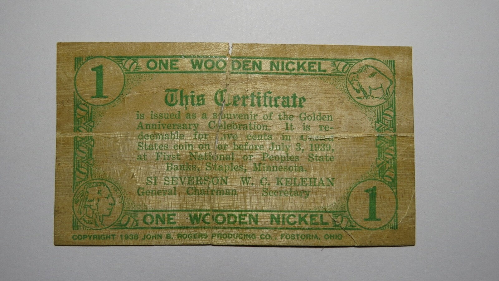 Up for auction is a $.05 1939 Staples Minnesota Obsolete Souvenir Wooden Nickel. This wooden nickel is dated July 3-5, 1939. This souvenir is made of wood and was issued for the Golden Anniversary Celebration of Staples, Minnesota. This bill is a must have for any collector of Obsolete Currency!