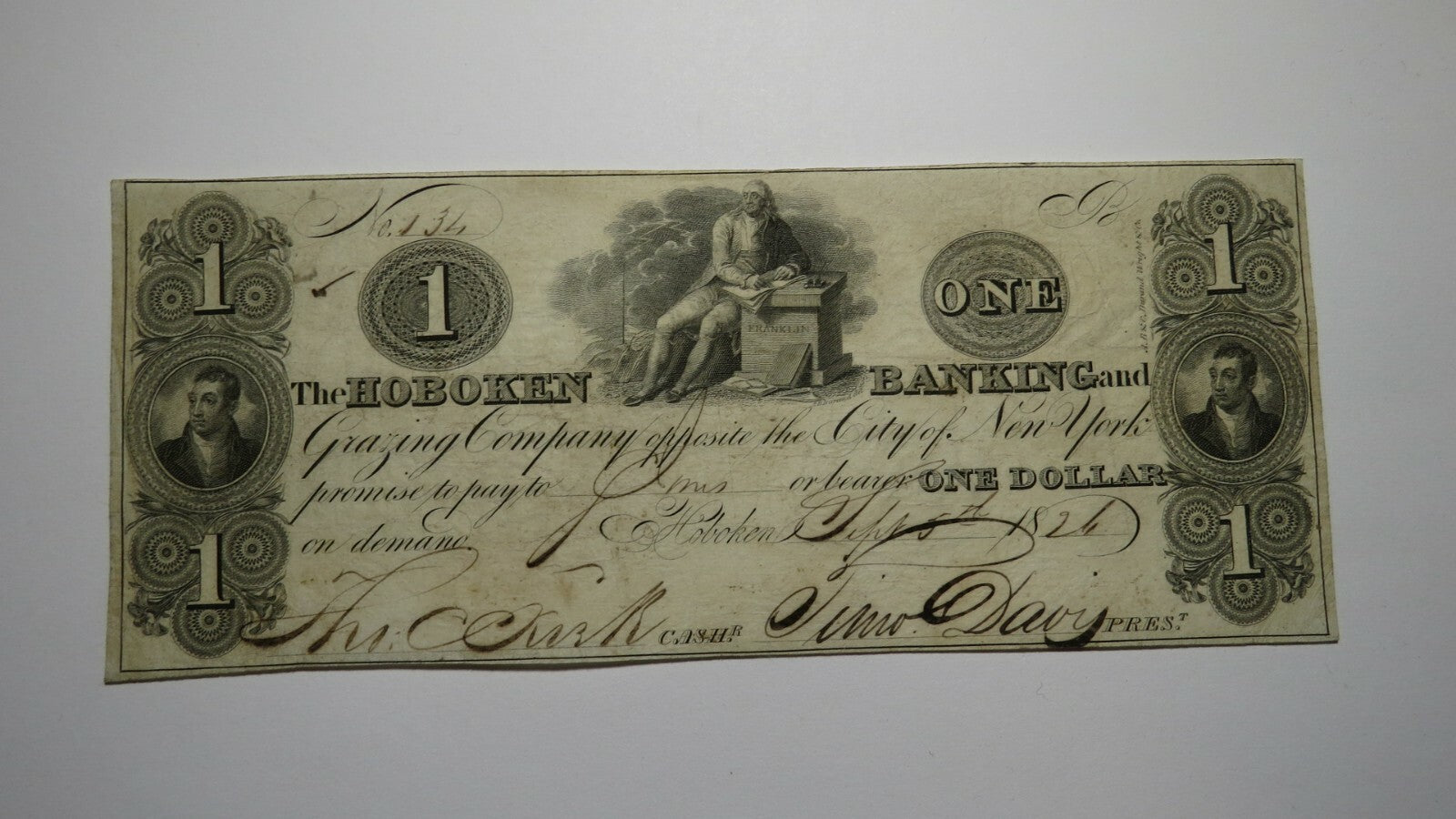 Up for auction is a $1 1826 Hoboken New Jersey Obsolete Bank Note. This note is dated September 5, 1826. This note was issued by The Hoboken Banking and Grazing Company. This bill is a must have for any collector of Obsolete Currency!