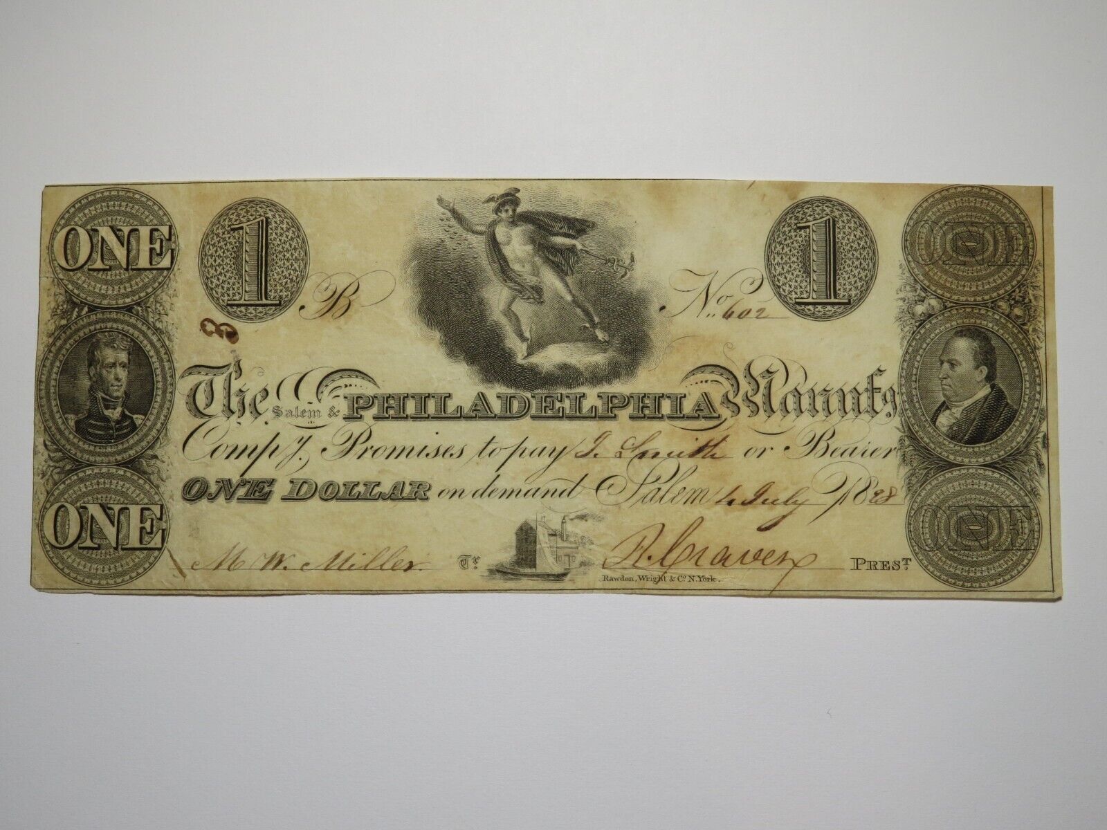 Up for auction is a $1 1828 Salem New Jersey Obsolete Bank Note. This note is dated July 4, 1828. This note was issued by The Salem & Philadelphia Manufacturing Company. This bill is a must have for any collector of Obsolete Currency!