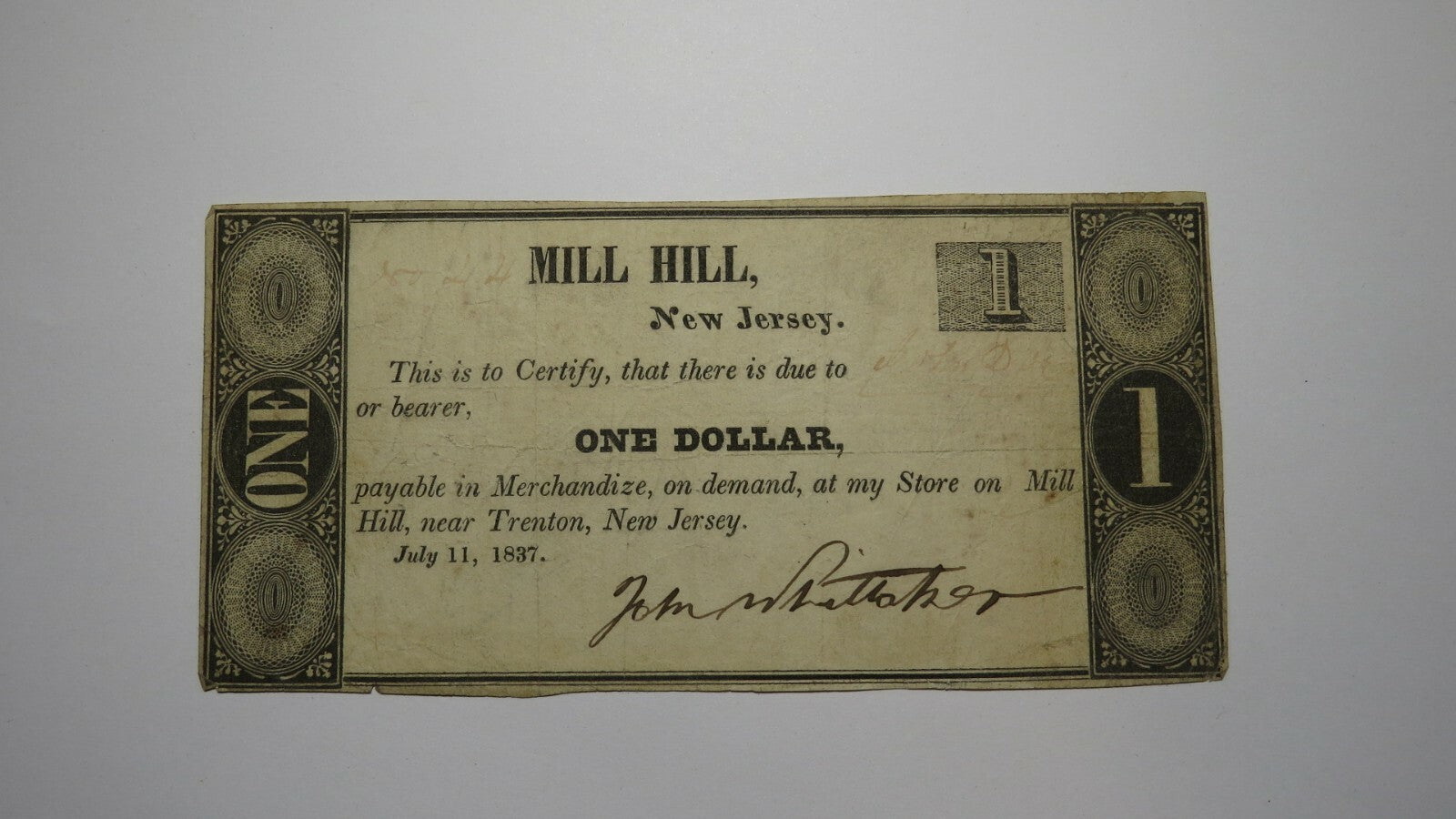 $1 1837 Mill Hill New Jersey NJ Trenton John Whittaker Obsolete Currency Note