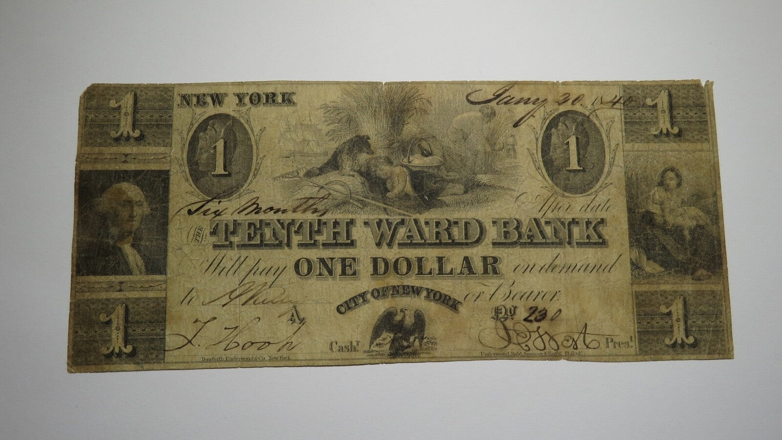 Up for auction is a $1 1840 New York City Obsolete Bank Note. This note is dated January 30, 1840. This bill is issued from The Tenth Ward Bank. This is a great bill from a tough to find town! This bill is a must have for any collector of Obsolete Currency!