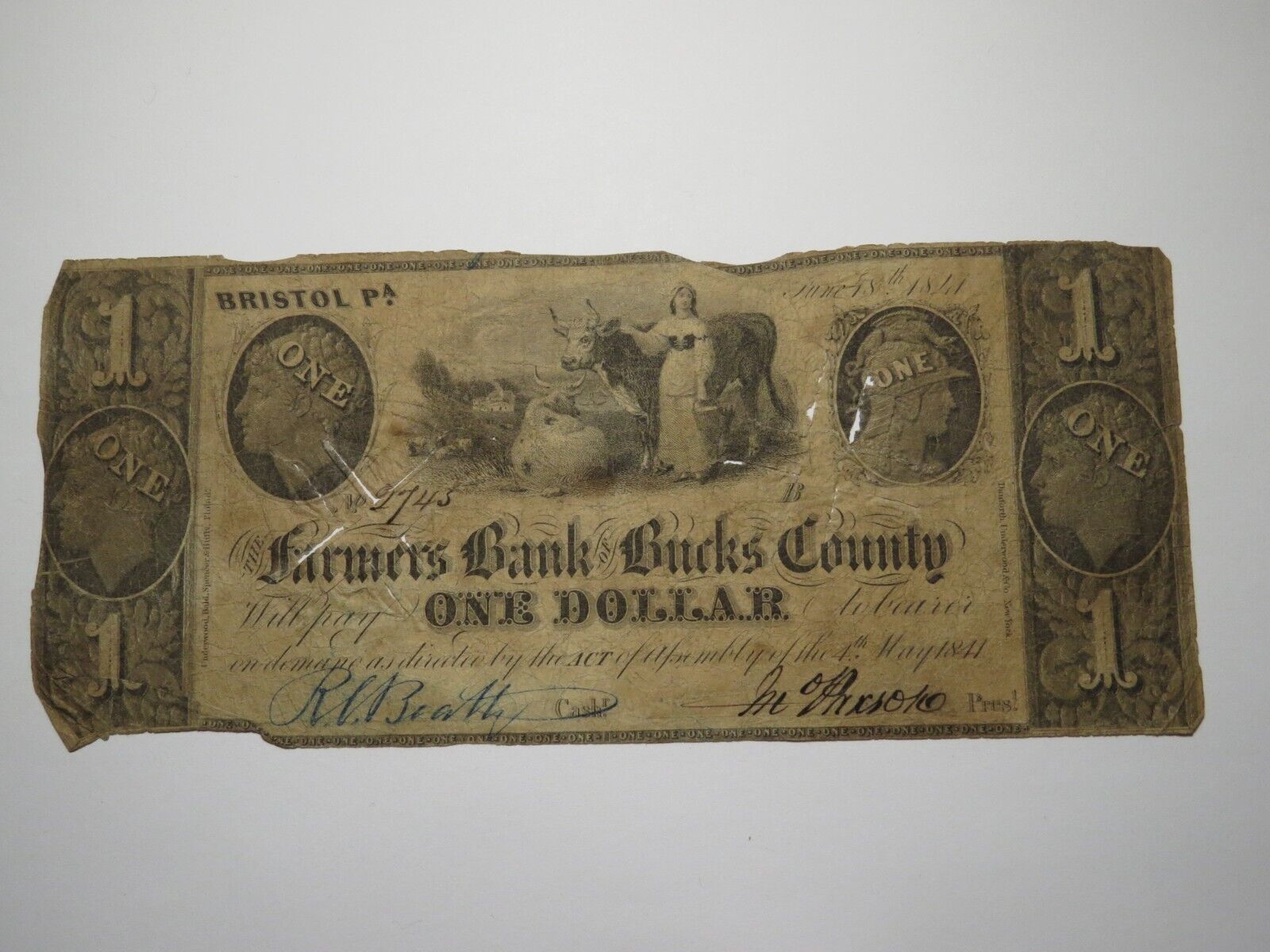 $1 1841 Bristol Pennsylvania PA Obsolete Currency Bank Note Bill Bucks County!