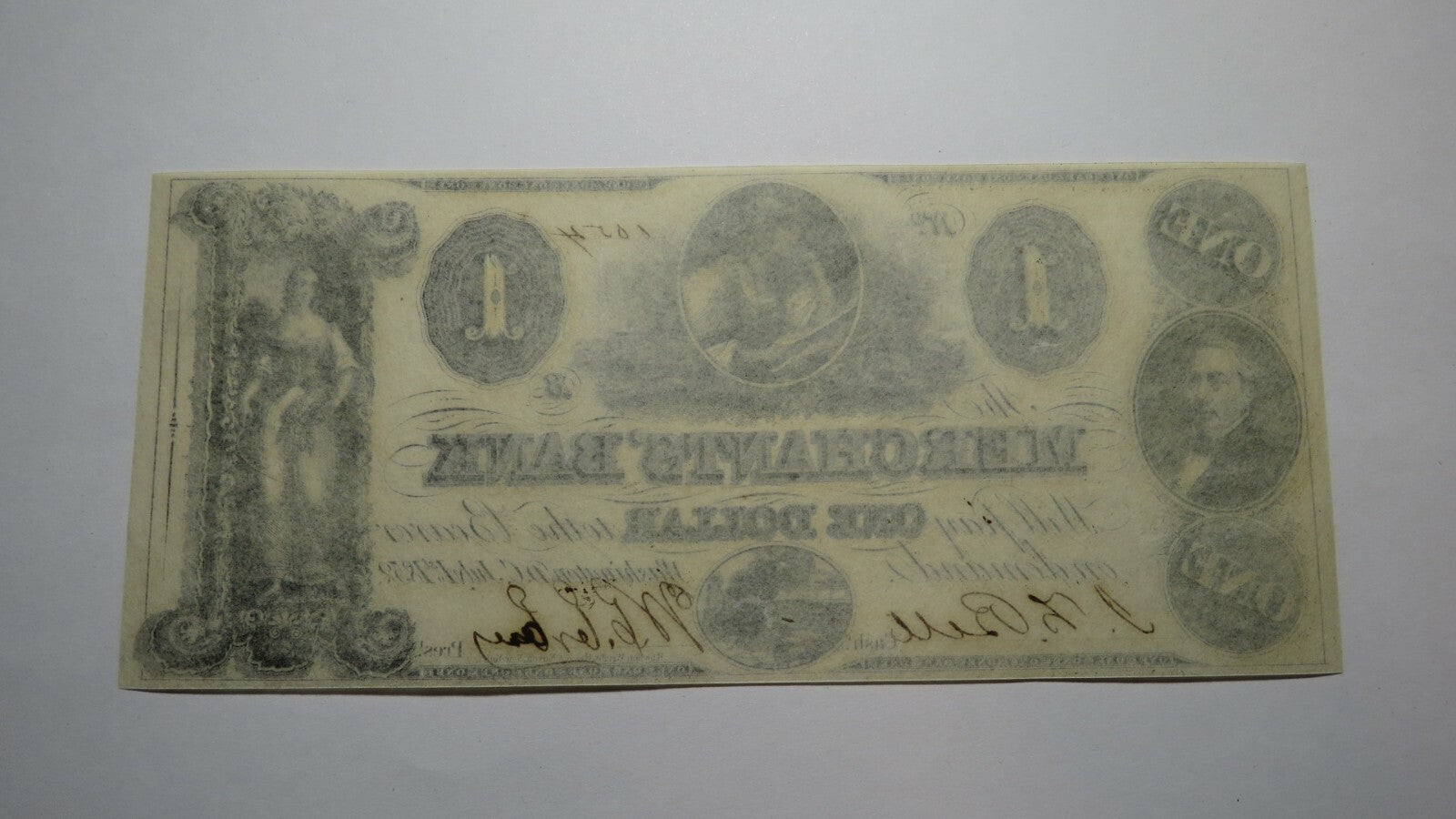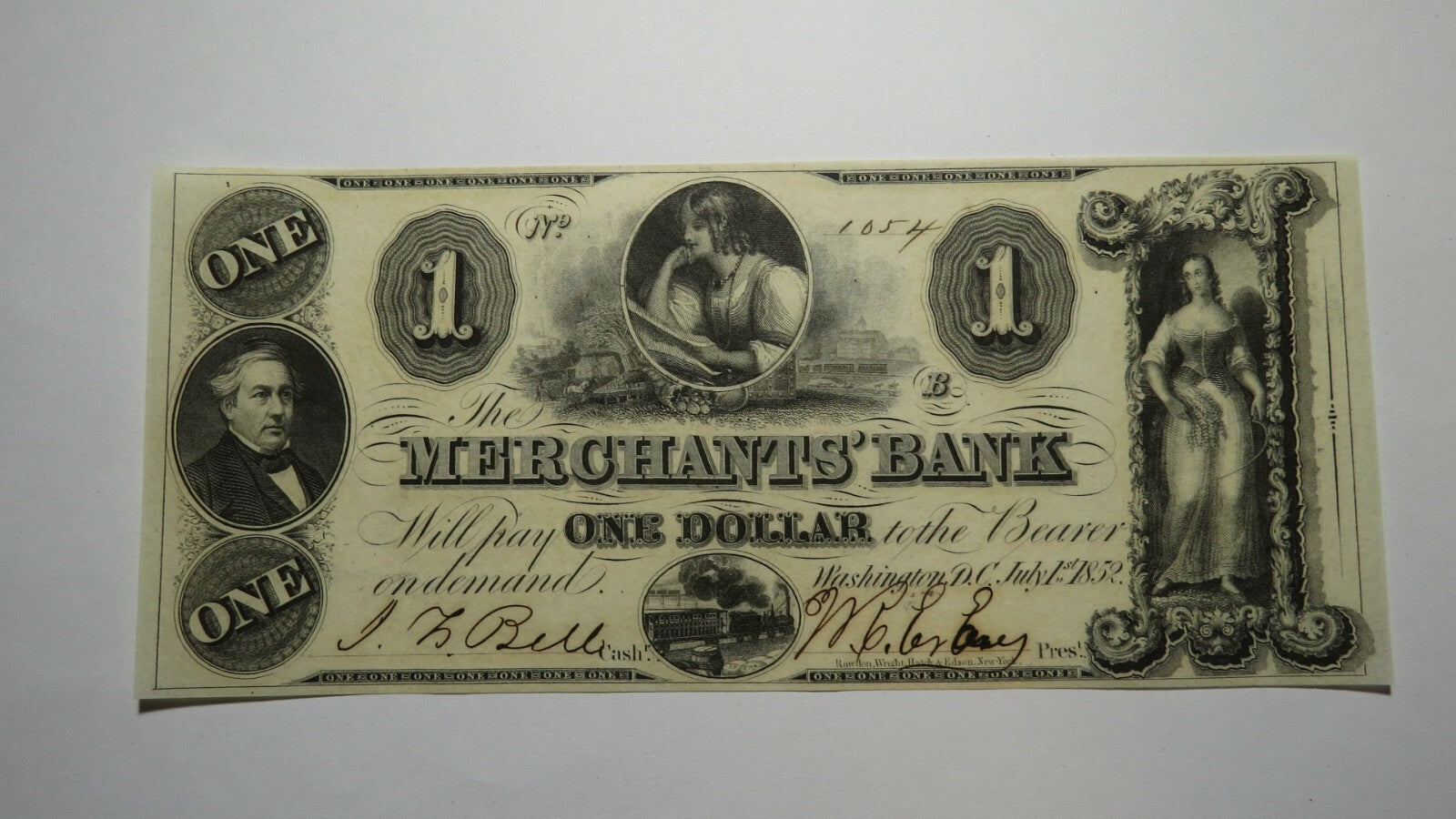 Up for auction is a $1 1852 Washington D.C. Obsolete Bank Note. This note is dated July 1, 1852. It is issued from The Merchants' Bank. This note is extremely rare, and it is getting much harder to find this type of bill! This bill is a must have for any collector of Obsolete Currency!