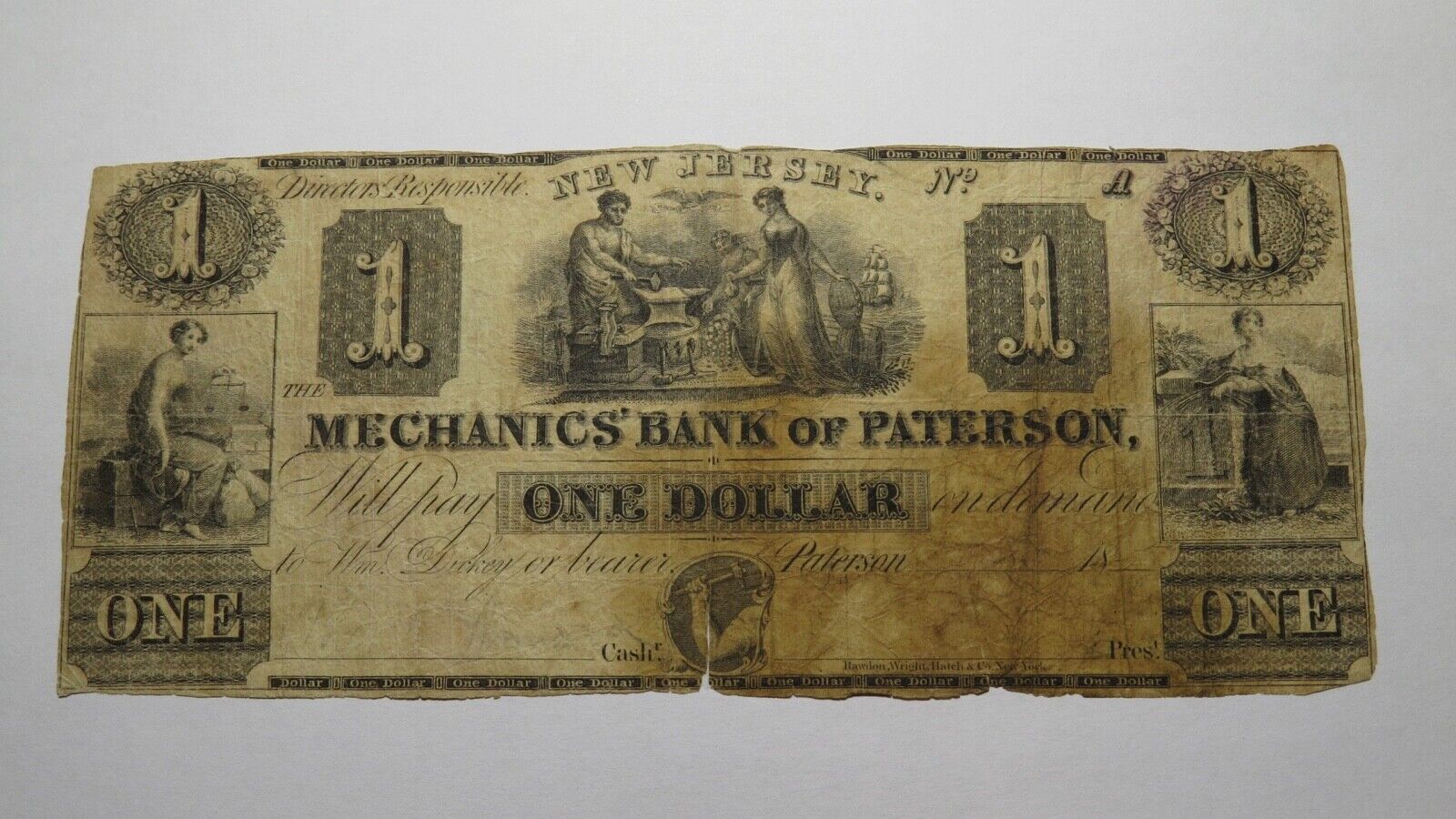 Up for auction is a $1 1855 Paterson New Jersey Obsolete Bank Note. This note is dated from 1855. This note was issued by The Mechanics Bank of Paterson. This bill is a must have for any collector of Obsolete Currency!