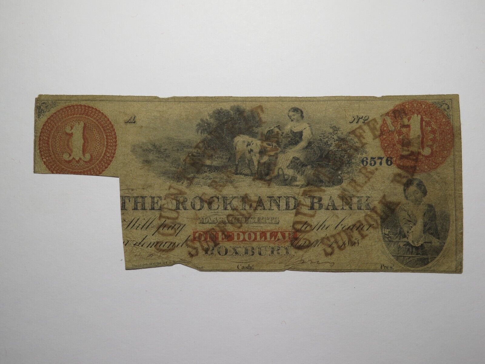 Up for auction is a $1 1858 Roxbury Massachusetts Obsolete Bank Note Bill. This note is dated March 1, 1858. This bill was issued by The Rockland Bank. This is a contemporary counterfeit and has been stamped as such. This is a great bill from a tough to find town! This bill is a must have for any collector of Obsolete Currency!