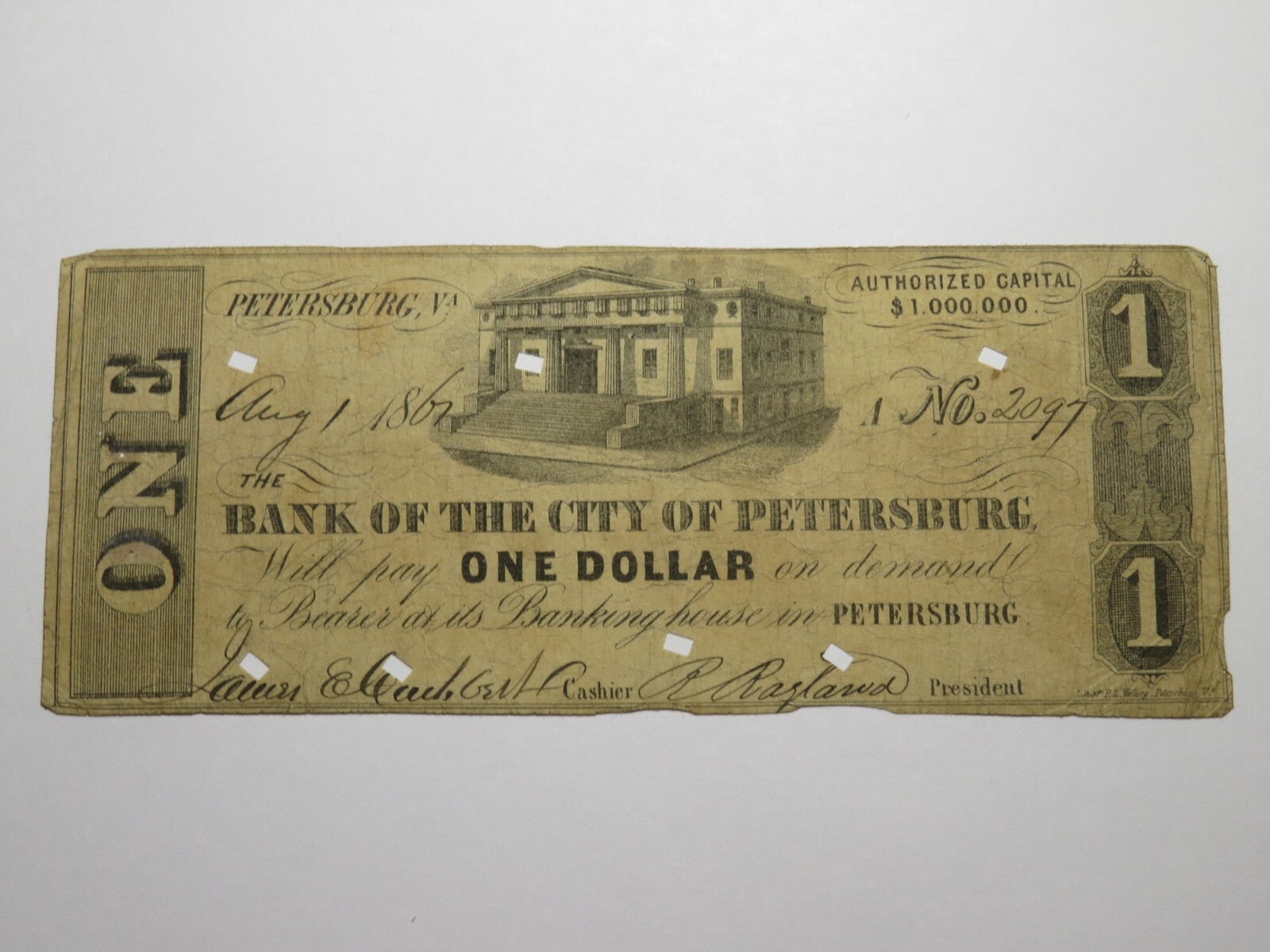 Up for auction is a $1 1861 Petersburg Virginia Obsolete Bank Note. This note is dated August 1, 1861. This note was issued by The Bank of the City of Petersburg. This bill is a must have for any collector of Obsolete Currency. If you have any questions please feel free to ask!