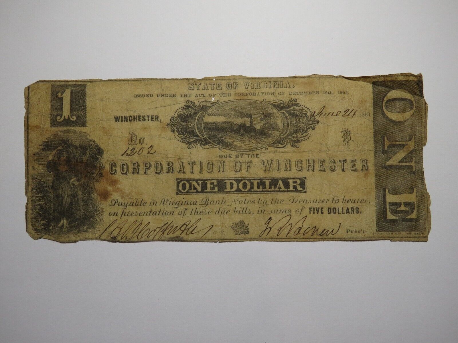 Up for auction is a $1 1861 Winchester Virginia Obsolete Bank Note