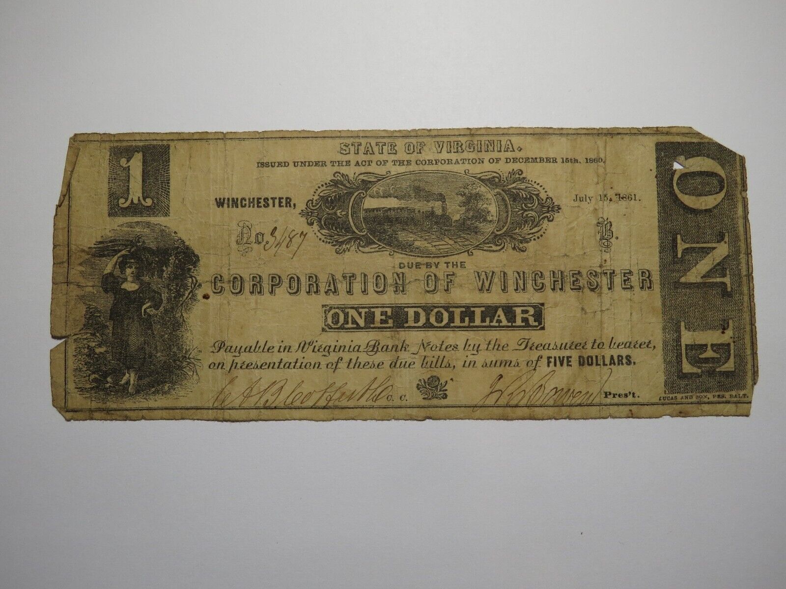 $1 1861 Winchester Virginia VA Obsolete Currency Bank Note Bill Corp. of Win.
