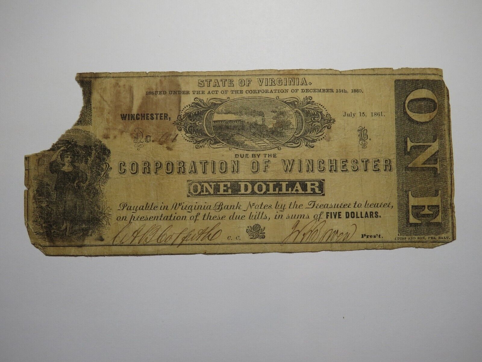 $1 1861 Winchester Virginia VA Obsolete Currency Bank Note Bill Corp. of Win.