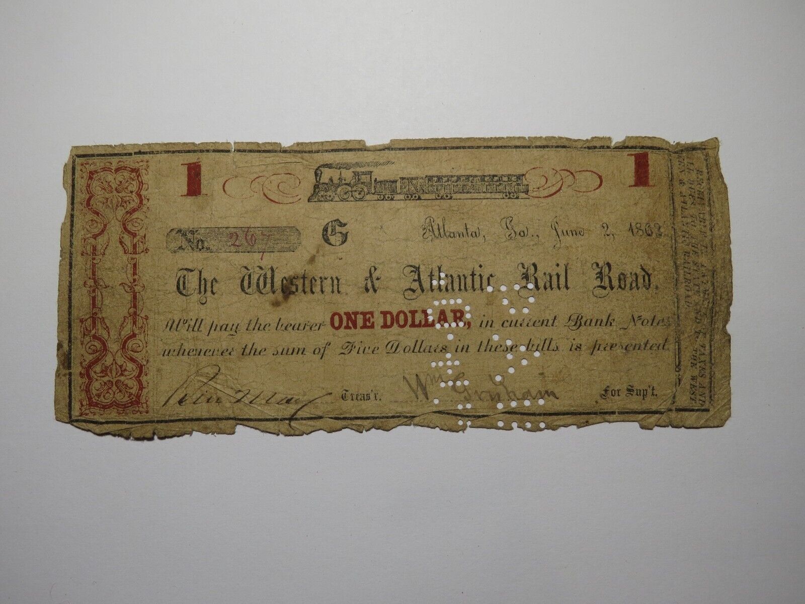 $1 1862 Atlanta Georgia Obsolete Currency Bank Note Bill Western Atlantic RR