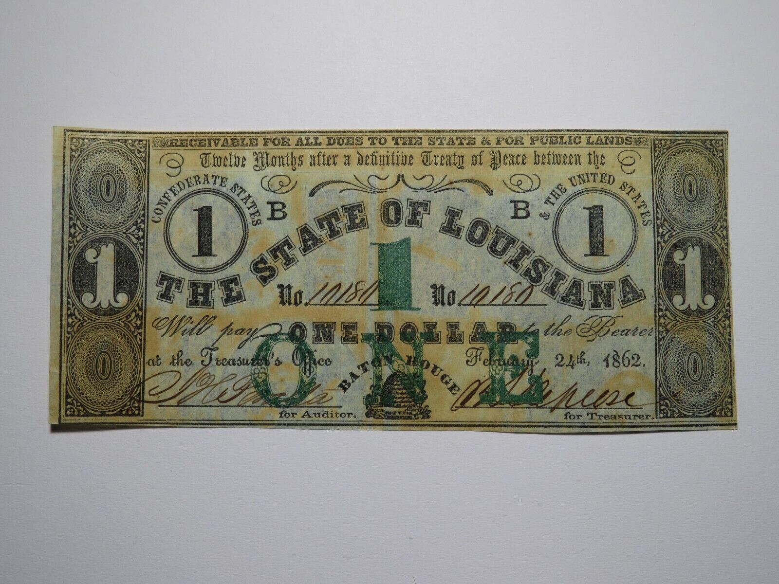Up for auction is a $1 1862 Baton Rouge Louisiana Obsolete Bank Note. This note is dated February 24, 1862. This bill was issued by the State of Louisiana. This bill is in Crisp Uncirculated condition. This note was printed on the back of a Holly Springs, Mississippi bank sheet. This is a great rare bill from a very popular Louisiana city! This bill is a must have for any collector of Obsolete Currency!