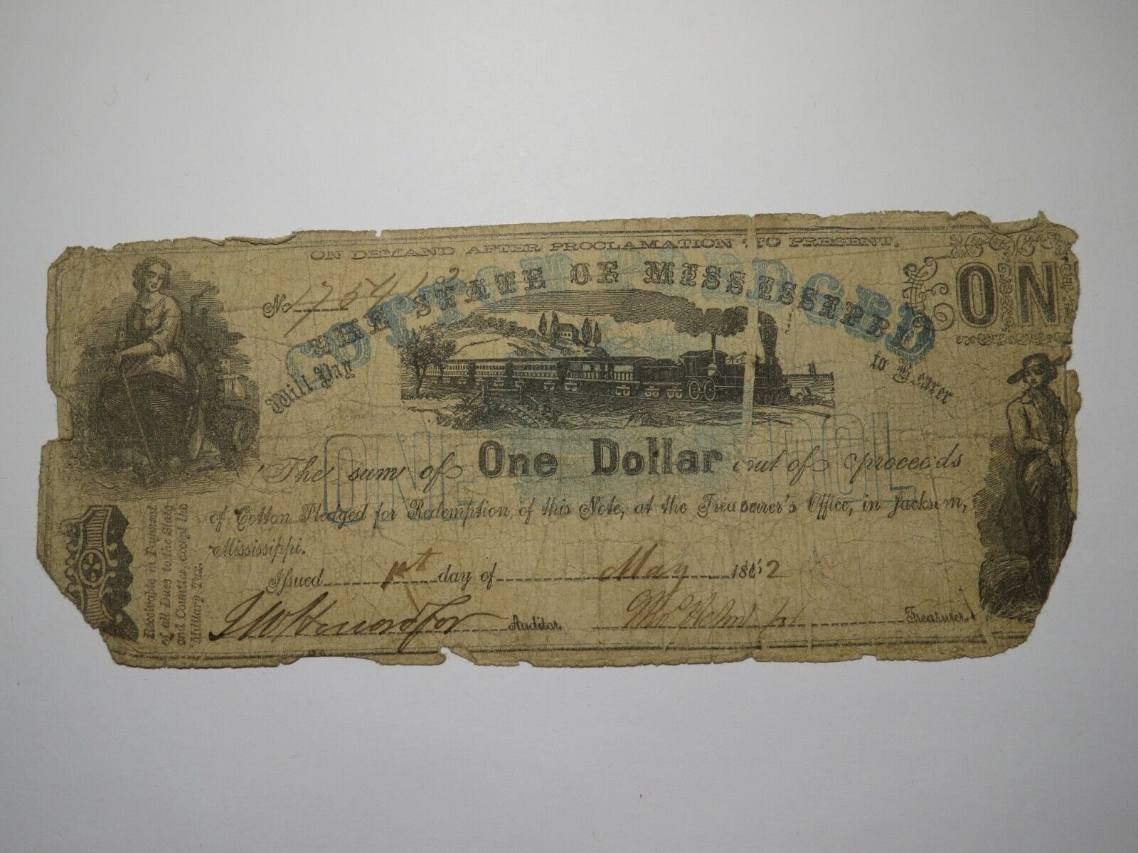 Up for auction is a $1 1862 Jackson Mississippi Obsolete Bank Note. This note is dated May 11, 1862. This bill was issued by The State of Mississippi. This is a great bill from a tough to find town! This bill is a must have for any collector of Obsolete Currency!