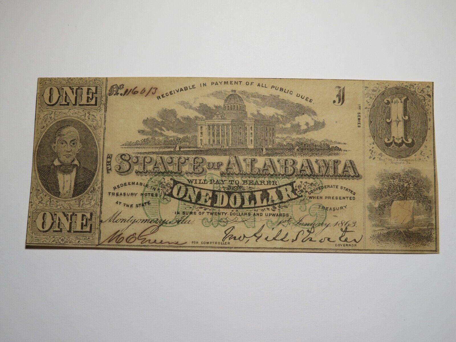 Up for auction is a $1 1863 Montgomery Alabama Obsolete Bank Note. This note is dated January 1, 1863. This note was issued by The State of Alabama. This note is in About Uncirculated condition. This bill is a must have for any collector of Obsolete Currency!