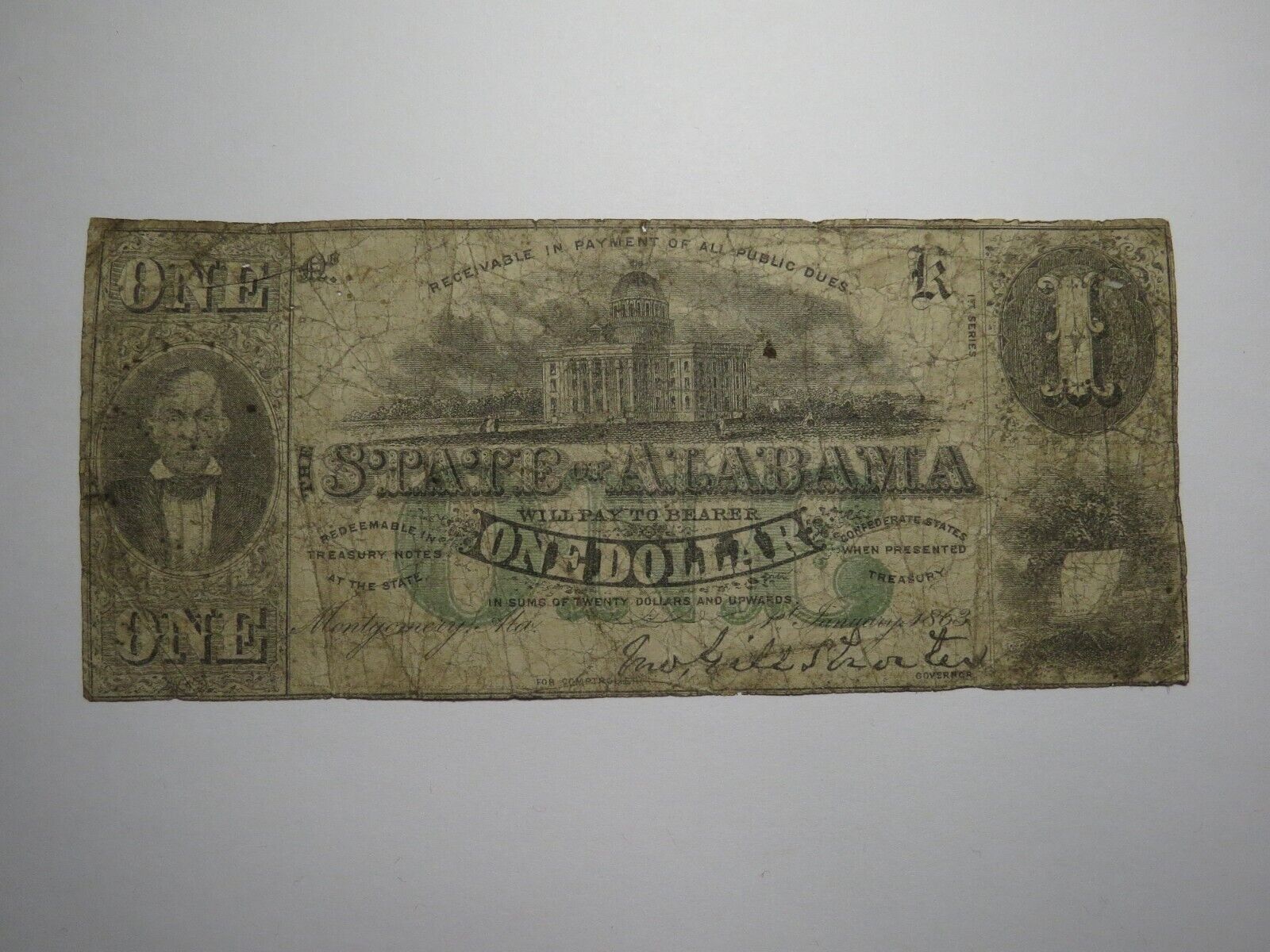 Up for auction is a $1 1863 Montgomery Alabama Obsolete Bank Note. This note is dated January 1, 1863. It is issued from The State of Alabama. This note is extremely rare, and it is getting much harder to find this type of bill! This bill is a must have for any collector of Obsolete Currency. If you have any questions please feel free to ask.