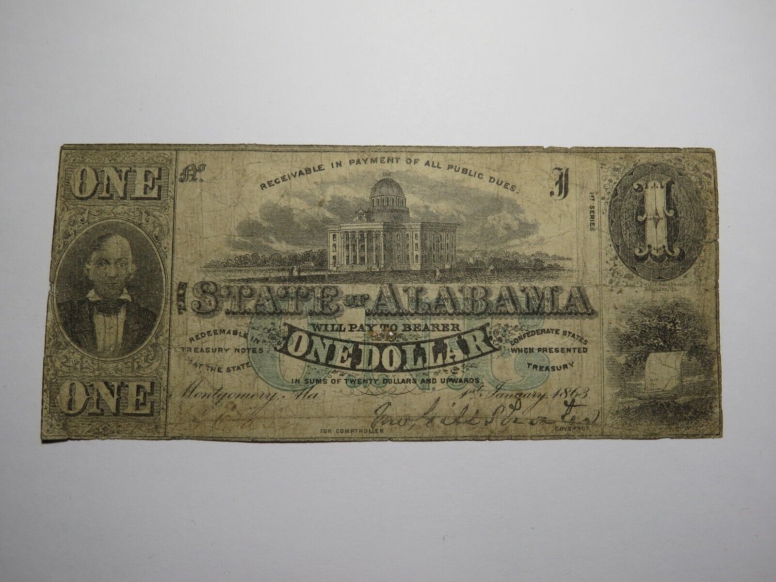 Up for auction is a $1 1863 Montgomery Alabama Obsolete Bank Note. This note is dated January 1, 1863. It is issued from The State of Alabama. This note is extremely rare, and it is getting much harder to find this type of bill! This bill is a must have for any collector of Obsolete Currency. If you have any questions please feel free to ask.