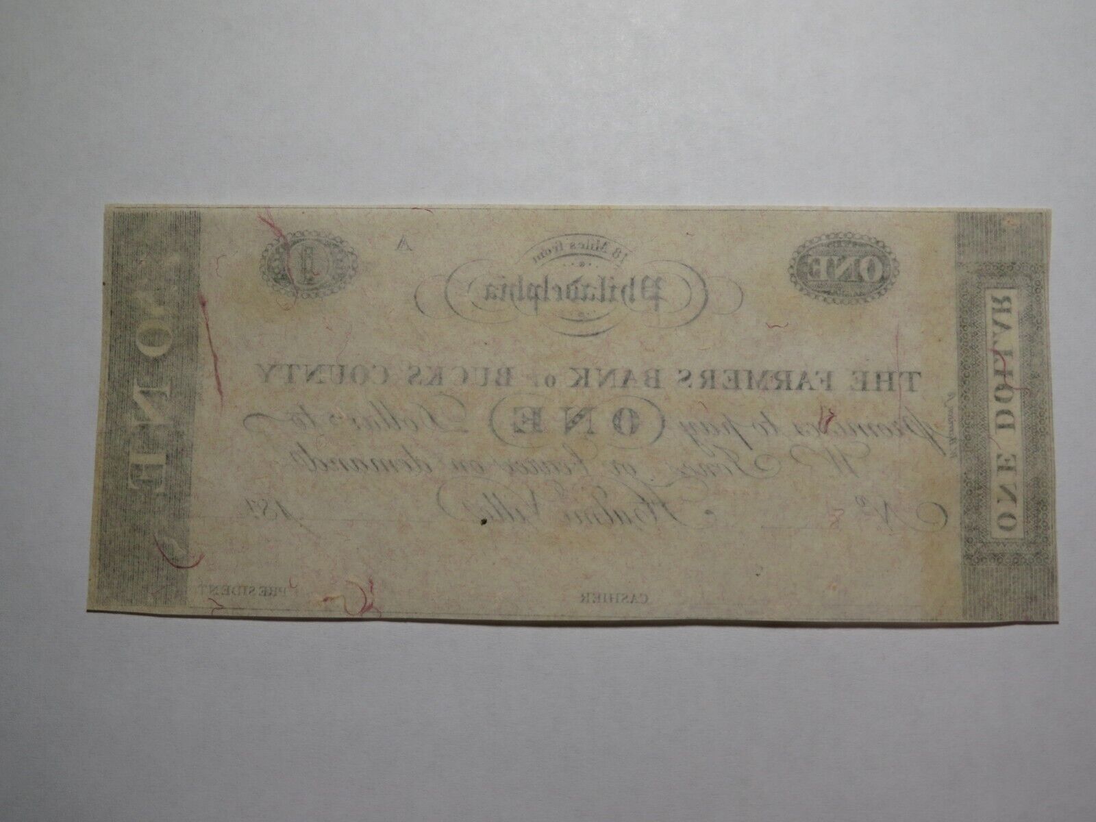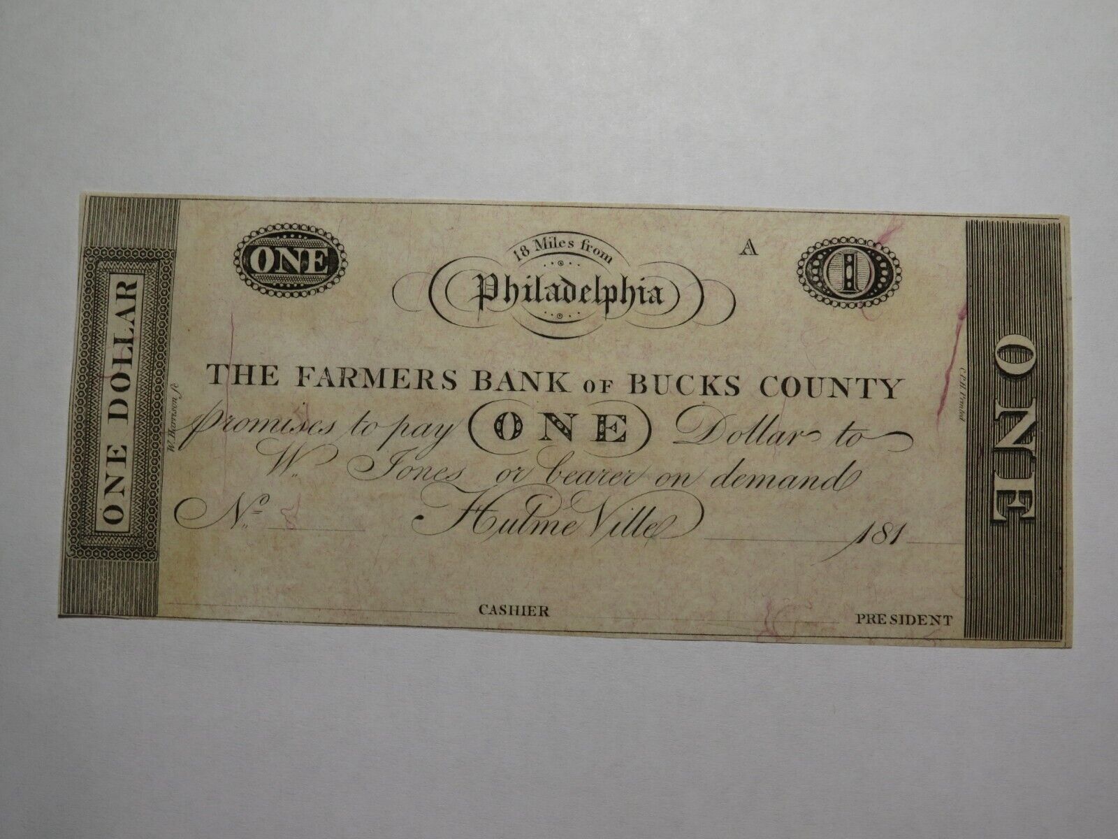 Up for auction is a $1 18__ Hulmeville Pennsylvania Obsolete Remainder Bank Note.  This note dates from the 1820's.  It was issued by The Farmers Bank of Bucks County.  This note is in Crisp Uncirculated condition.  This bill is a must have for any collector of Obsolete Currency.  If you have any questions please feel free to ask!