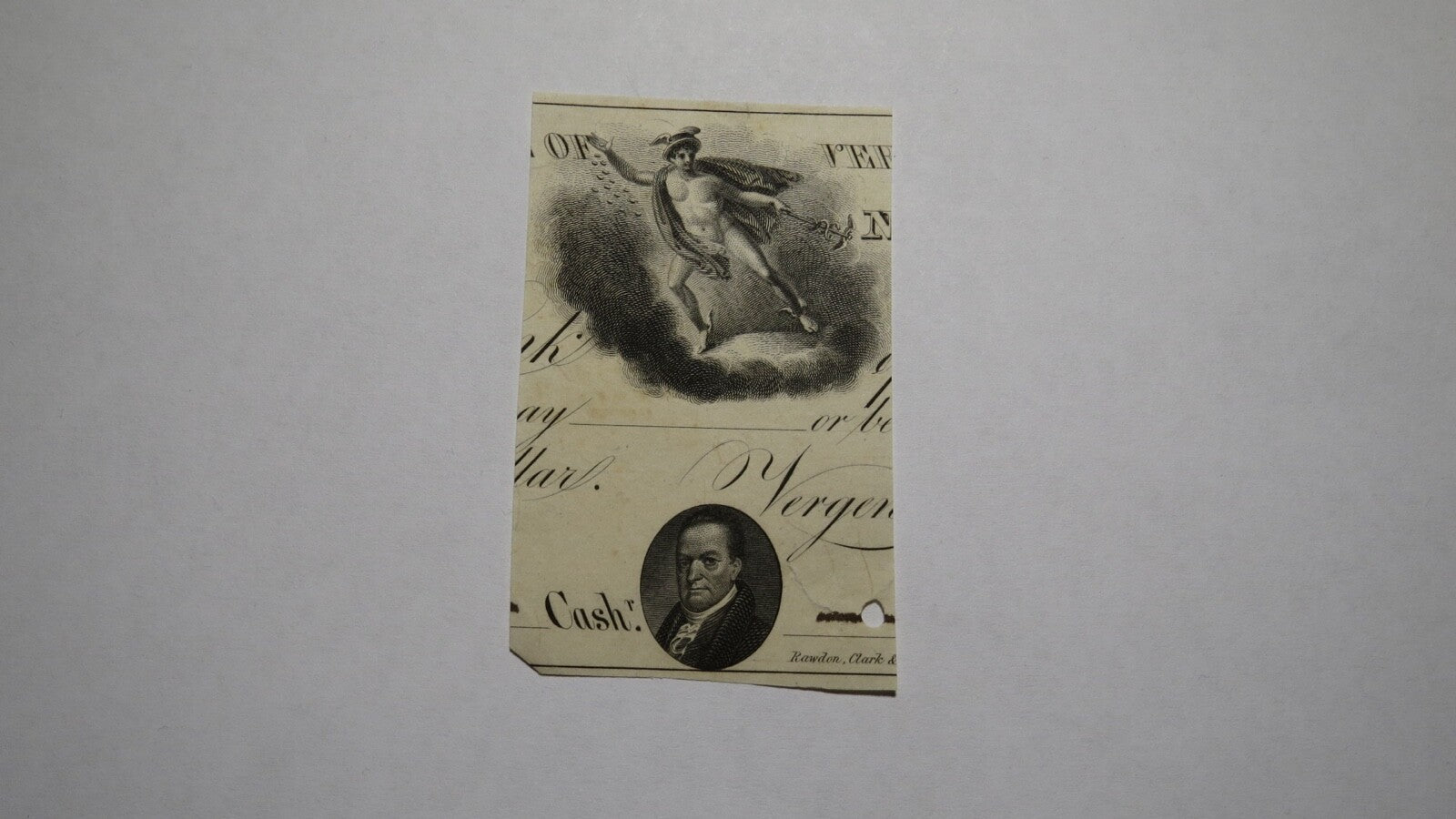 Up for auction is a $1 18__ Vergennes Vermont Obsolete Bank Note Bill Remnant. This bill was issued from the Bank of Vergennes. This proof note was cut up at some point in time, and this piece is all that has survived. This bill is a must have for any collector of Obsolete Currency!