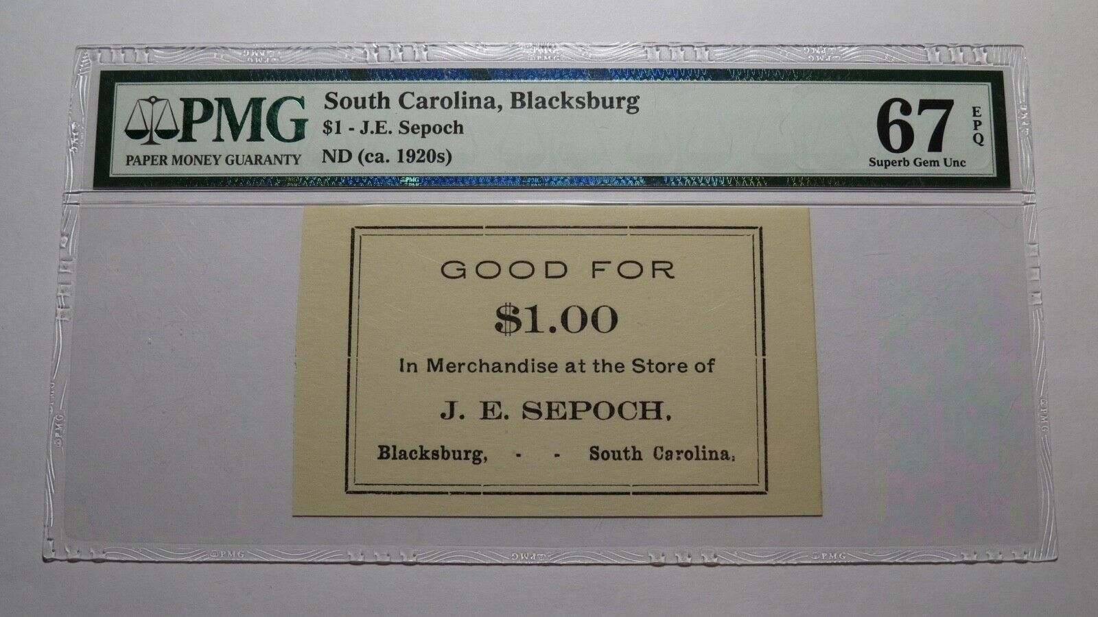 Up for auction is a $1 1920's Blacksburg South Carolina Currency Note. This note is dated from the 1920's. This note was issued J.E. Sepoch. This note has been graded Superb Gem Uncirculated 67EPQ by PMG. There is nothing wrong with this note. This bill is a must have for any collector of Colonial Currency!