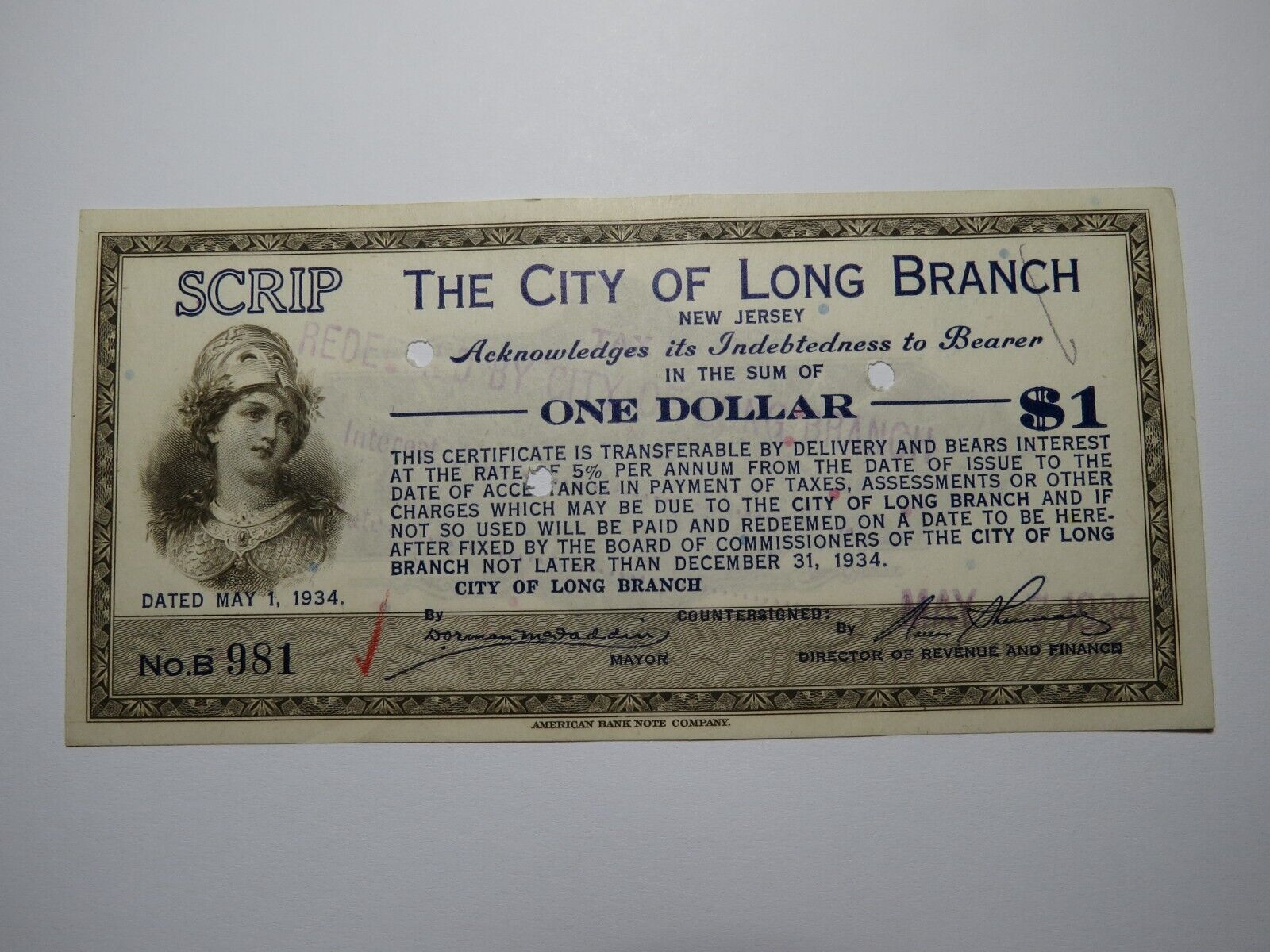 $1 1934 Long Branch New Jersey Obsolete Currency Scrip!