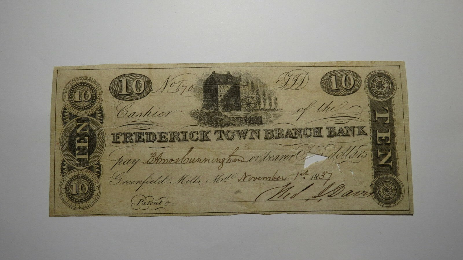 $10 1837 Greenfield Mills Maryland MD Obsolete Currency Bank Note Bill Frederick
