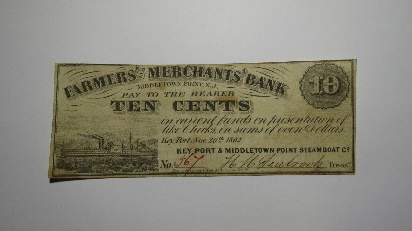 Up for auction is a $.10 1862 Middletown Point New Jersey Obsolete Bank Note. This note is dated November 20, 1862. It is issued from The Farmers' and Merchants' Bank & The Keyport and Middletown Point Steamboat Company. This note is extremely rare, and it is getting much harder to find this type of bill! This bill is a must have for any collector of Obsolete Currency!